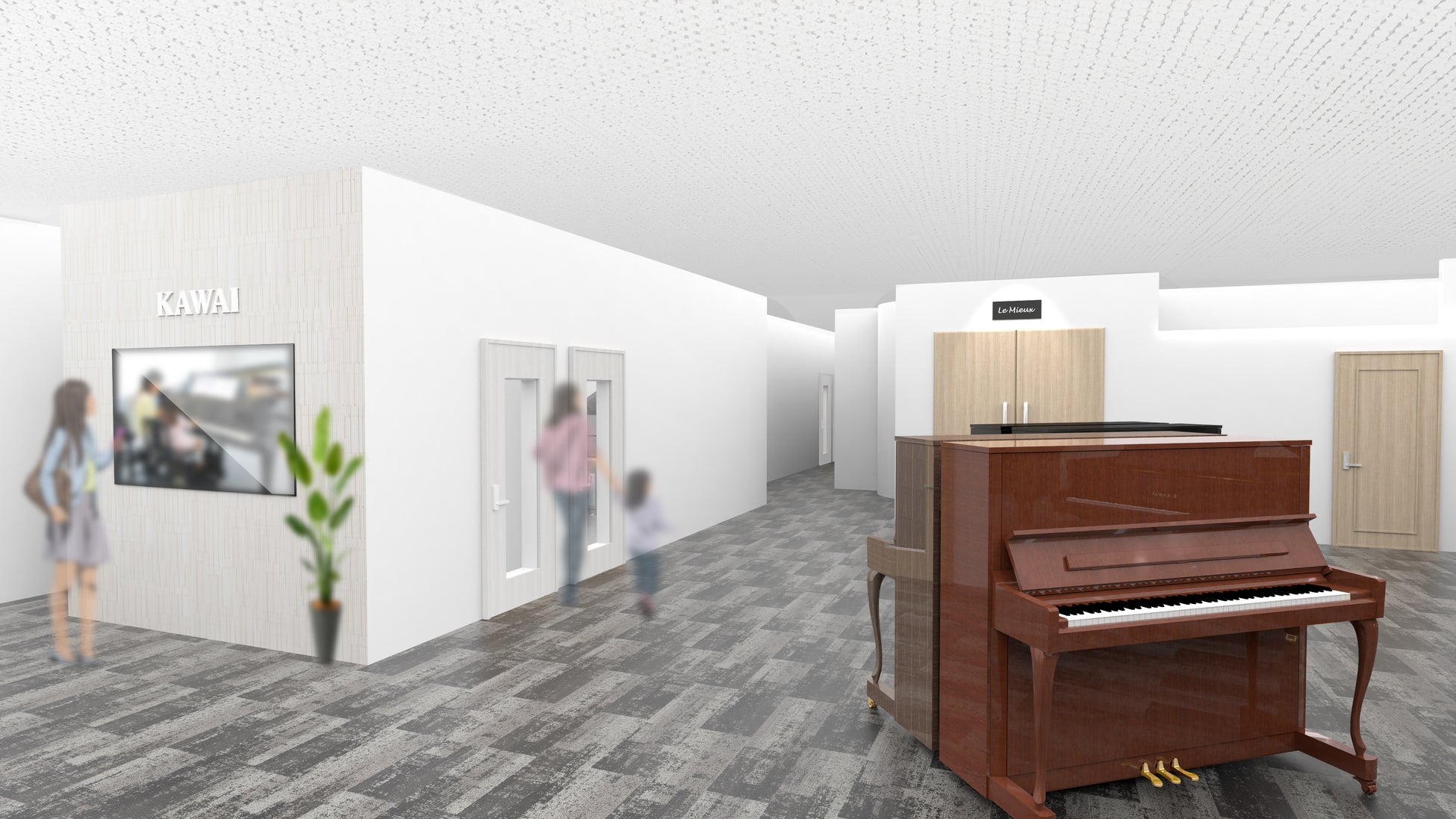 『カワイ川口』では、フラッグシップモデルのグランドピアノ「Shigeru Kawai」をはじめとする高付加価値ピアノの展示・販売に加え、豊富な楽譜を取り揃えています。また、ピアノレッスンに最適な環境を備えた「カワイ音楽教室」や、約100名を収容可能なミュージックサロン「Le Mieux(ル・ミュー)」を併設し、コンサートや発表会、音楽イベントなどを通じて、地域に開かれた音楽文化の発信拠点として展開してまいります。