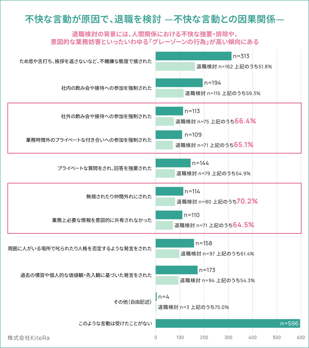 また、「不快な言動が原因で退職を検討」した人が受けた不快な言動との因果関係を深掘りしていくと、退職検討につながる不快な言動は「無視されたり仲間外れにされた」が70.2%と最多、次いで「社外の飲み会や接待への参加を強制された」が66.4%、「業務時間外のプライベートな付き合いへの参加を強制された」が65.1%という結果となりました。