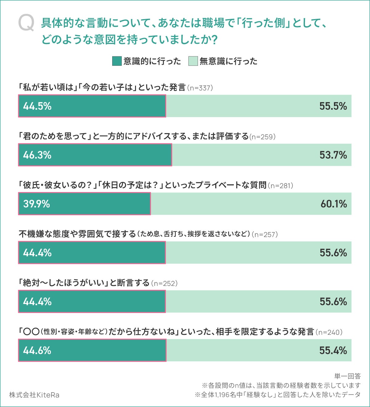 一方で、約4割(約40%〜46%)は「意識的に」これらの言動を行っていたことも明らかになりました。特に「『私が若い頃は』『今の若い子は』といった発言」は、経験者の44.5%が意識的に行ったと回答し、「『君のためを思って』と一方的にアドバイスする、または評価する」の項目では、経験者の約46%が意識的に行ったと回答しており、意図して不快感を与えうる言動を行ってしまう実態も示されています。