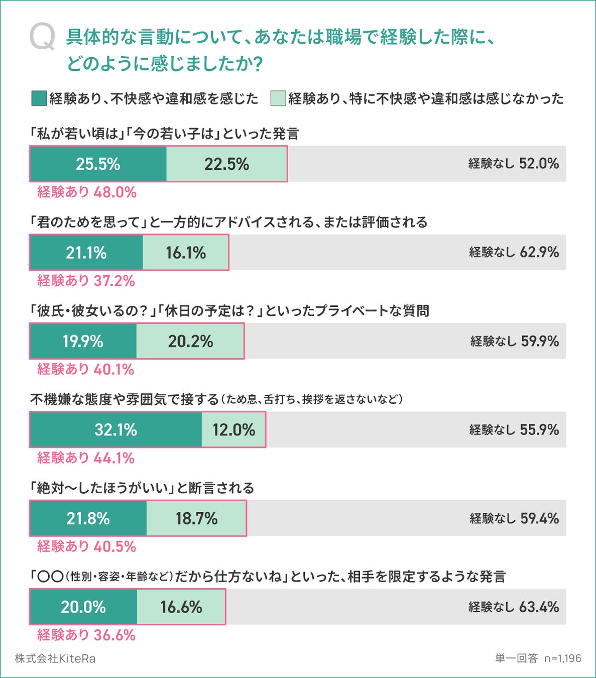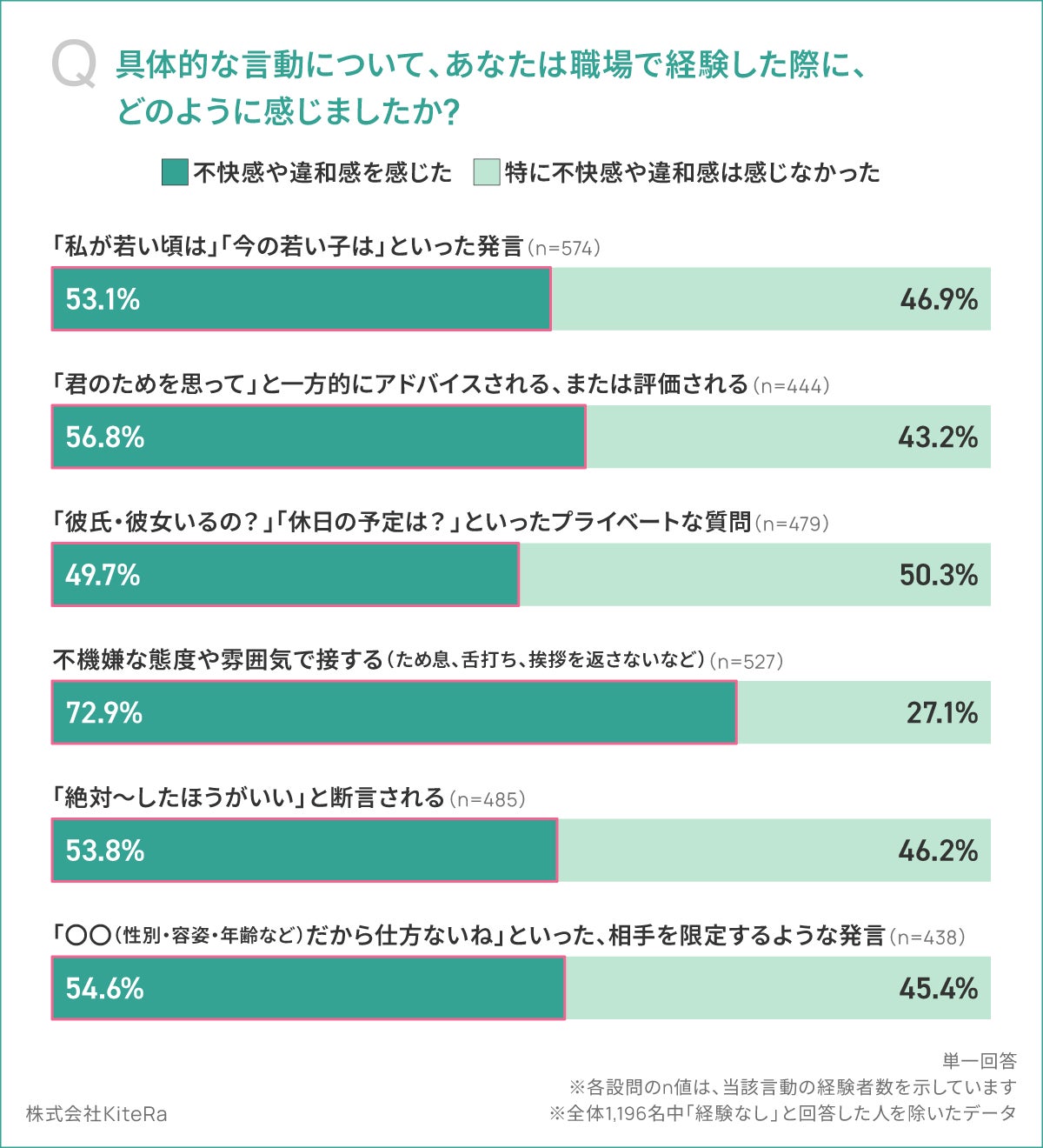 さらに、経験した言動に対して不快感や違和感を感じたかを聞いたところ、「『君のためを思って』と一方的にアドバイスされる、または評価される」を経験した人の56.8%が不快感・違和感を感じ、「『私の若い頃は』『今の若い子は』といった発言」を経験したことのある人の53.1%が不快感・違和感を感じていることが明らかになりました。
