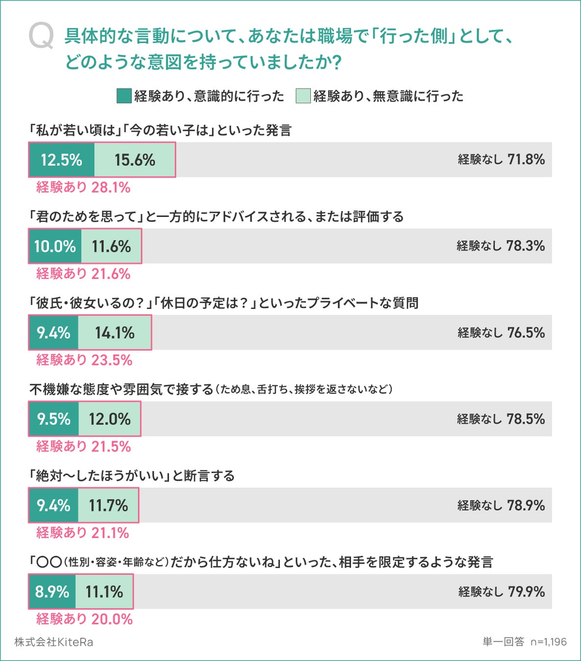 「具体的な言動について、あなたは職場で『行った側』として、どのような意図を持っていましたか(単一回答)」と質問したところ、28.1%が「『私が若い頃は』『今の若い子は』といった発言」を行った経験ありと回答しました。