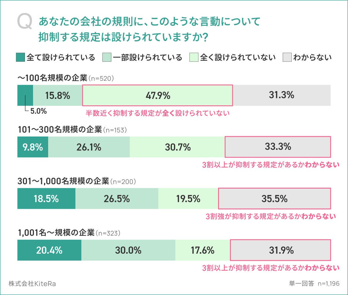 「あなたの会社の規則に、このような言動について抑制する規定は設けられていますか(単一回答)」と質問をしたところ、一部を含め設けられていると回答した人は34.7%にとどまりました。6割以上の人が、規定について「全く設けられていない」「わからない」と回答するなど、グレーゾーンハラスメント規定に対しての認識の低さが明らかになりました。