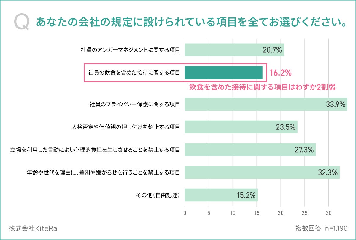 一方、最も回答が少なかったのは「社員の飲食を含めた接待に関する項目」が16.2%と、他の規定と比べても整備がされていないことがわかりました。