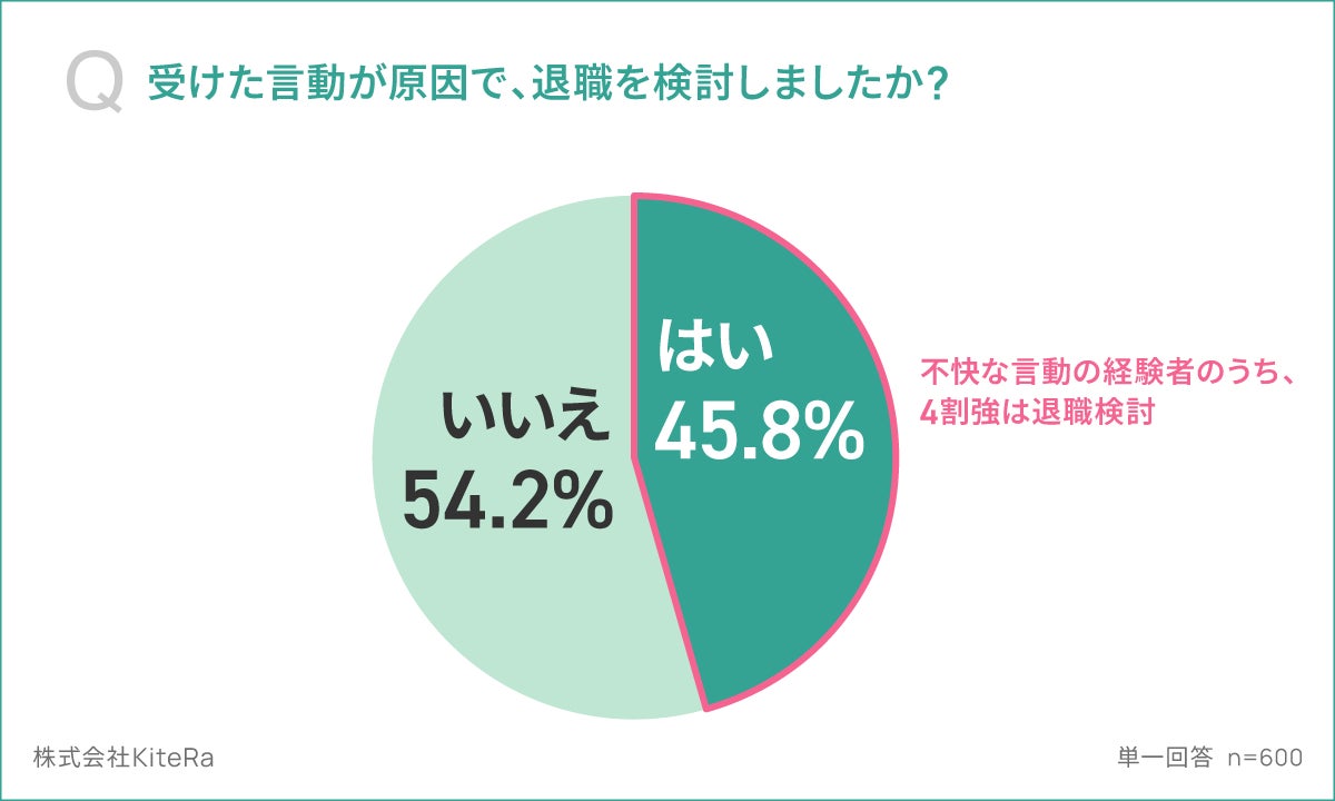 さらに「受けた言動が原因で、退職を検討しましたか(単一回答)」と質問すると、「はい」が45.8%と、不快な言動の経験者のうち、4割強は退職を検討したことがあることがわかりました。