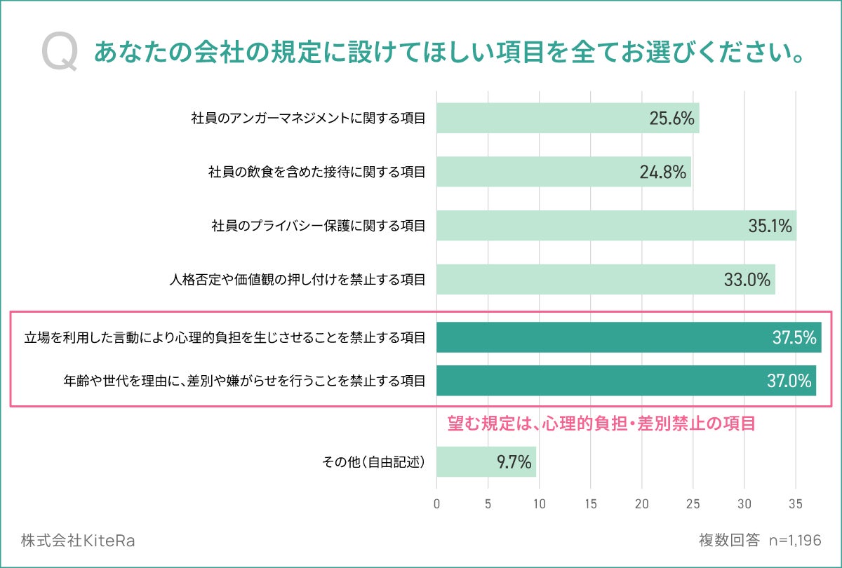 望む規定は心理的負担・差別禁止の項目 「年齢や世代を理由に、差別や嫌がらせの禁止」37.0%、「立場を利用した言動により心理的負担を生じさせることの禁止」37.5%、差別や心理的負担を生む言動への禁止規定に高いニーズあり
