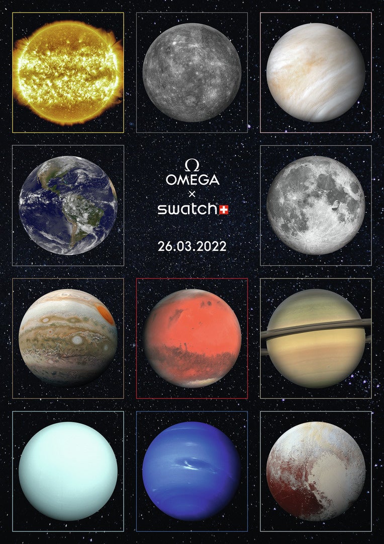 4日後の3月21日、この2つのブランドは同じパブリケーションに再び掲載され、コラボレーションに関する小さなヒントが明かされました。OMEGA X Swatch のロゴが、発売予定日とともに初めて登場し、時計のデザインが連想できるよう、太陽系の 11 の天体 (9 つの惑星、太陽、月) も広告にそれぞれの色で表されました。