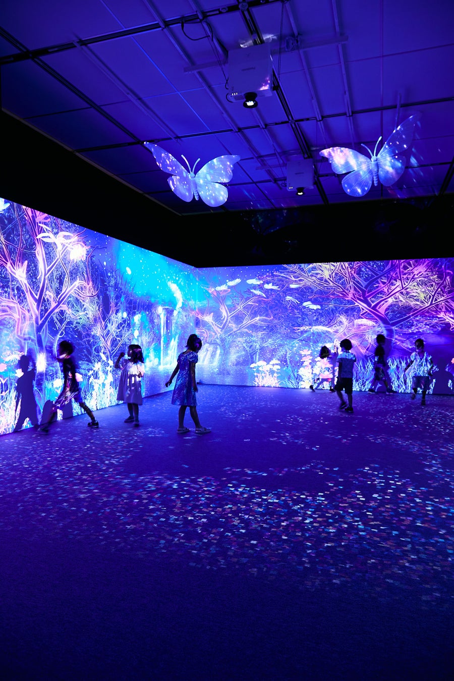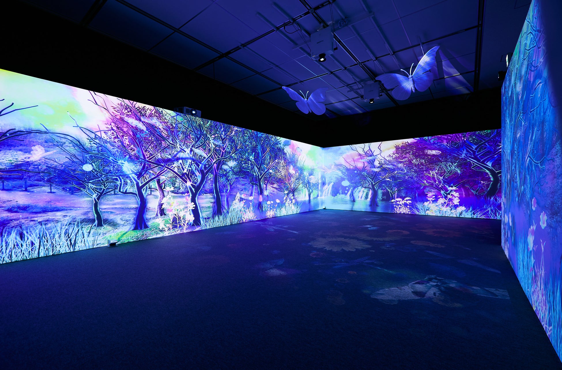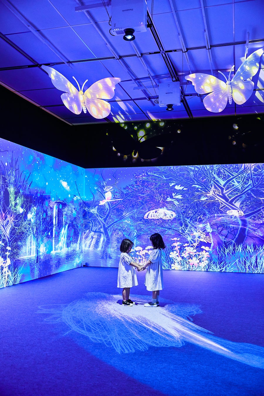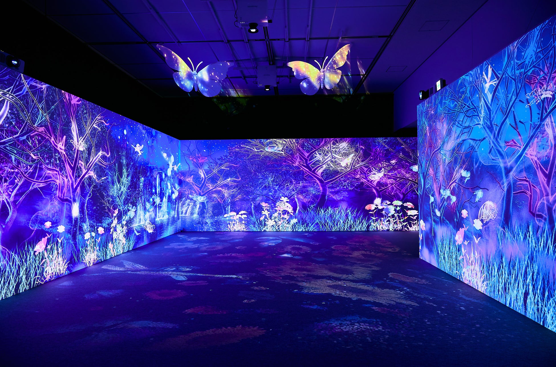 昆虫の楽園をテーマにしたプロジェクションマッピング演出。2022 年8月28日(日)まで、金山南ビル美術館棟(旧名古屋ボストン美術館)で公開中。