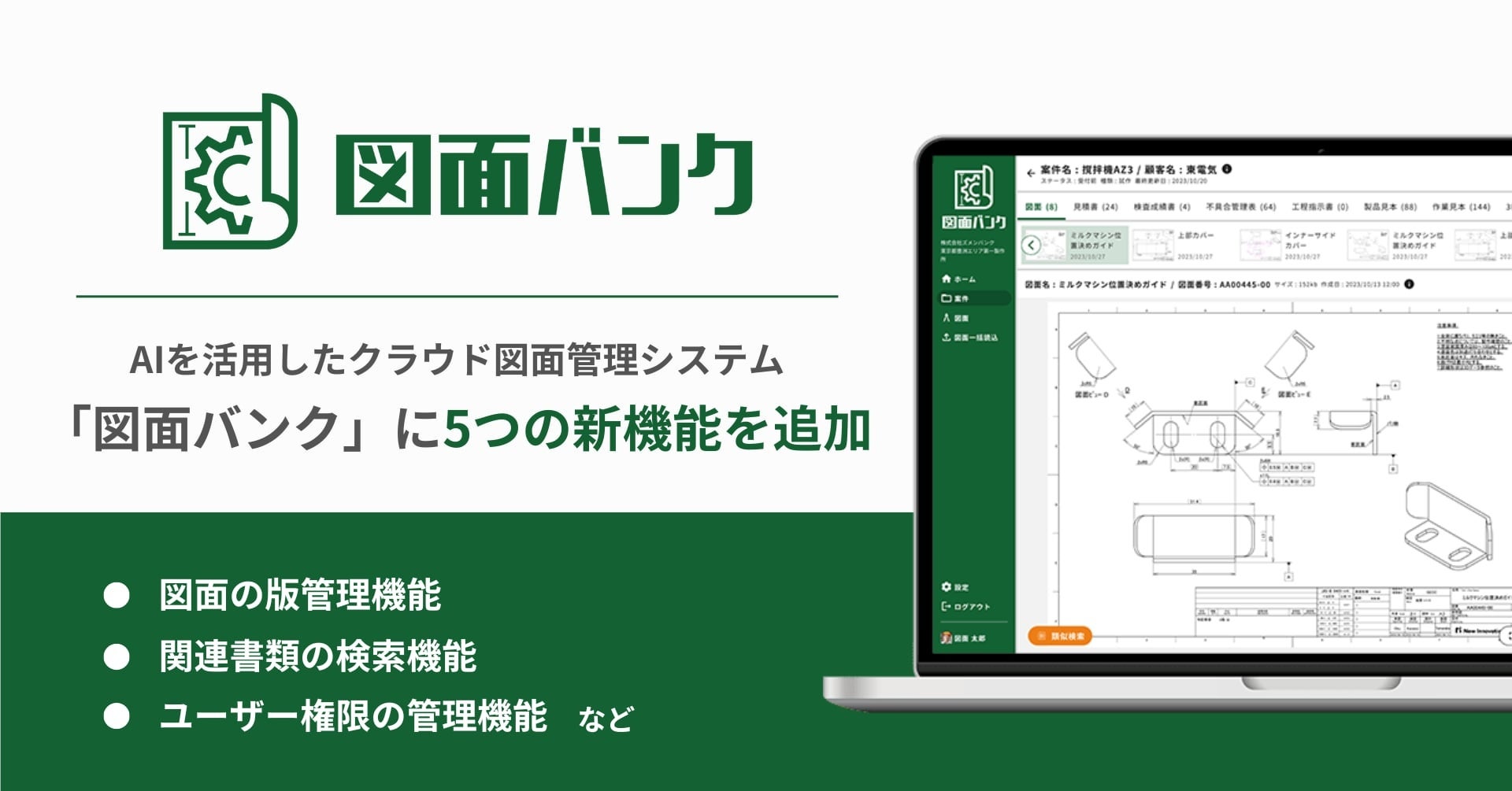 AIを活用したクラウド図面管理システム「図面バンク」に版管理機能や関連書類の検索機能など5つの新機能を追加