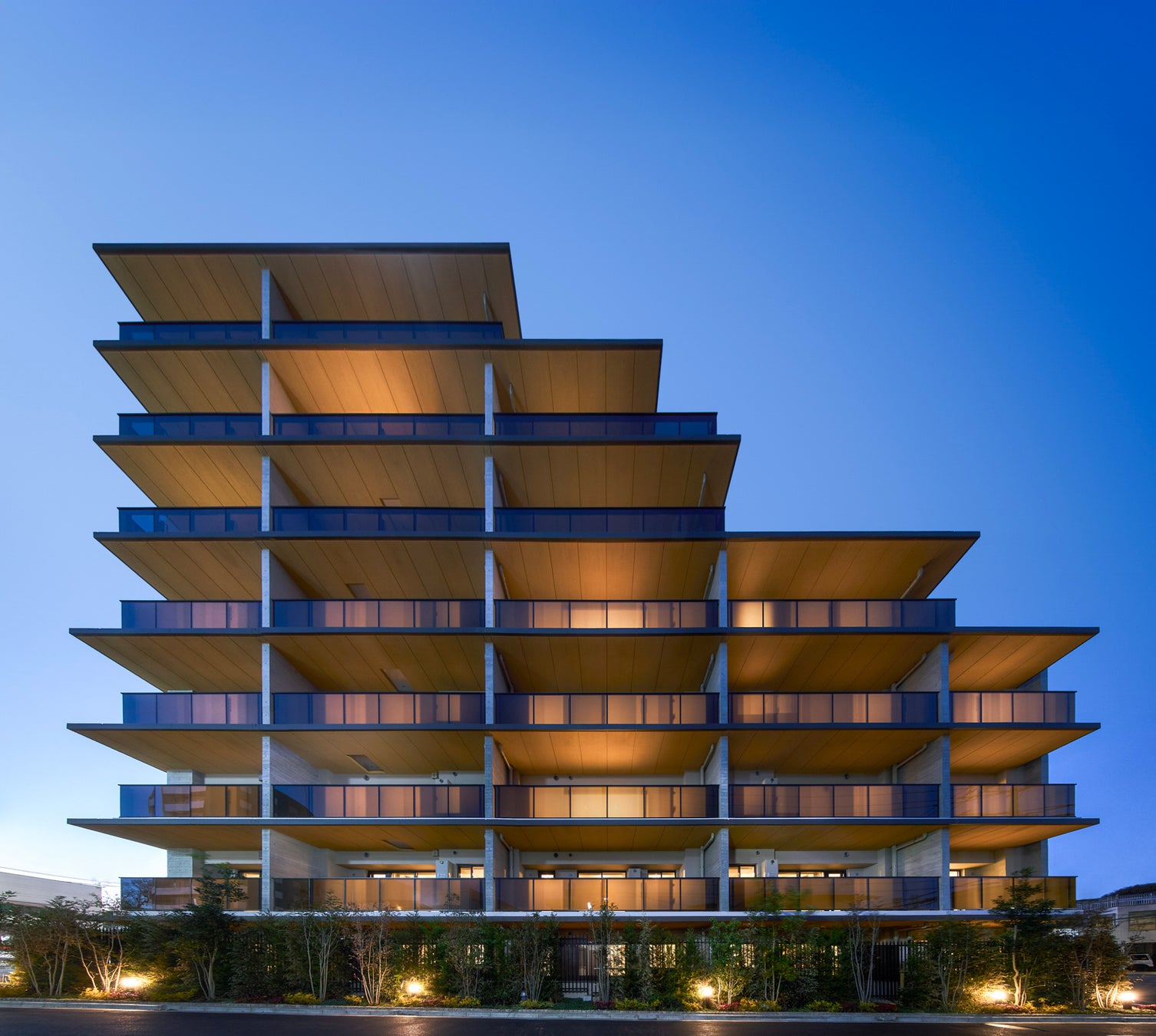 都市と自然の共存を意識した設計が印象的な集合住宅である。幹線道路沿いという立地条件に配慮し、遮音性を確保しながらも、周辺住民が大切にする「空とのつながり」を損なわないよう工夫されている。建物全体を「空に向かって伸びる樹木」と見立て、中低層の構成によって背景の空を広く見せる設計が採用されている。バルコニー庇の深い目地で力強い幹を、杉板型枠仕上げの戸境壁で繊細な枝を表現するなど、シンプルにデザインをまとめつつ街に対する気遣いが感じられるデザインである。このプロジェクトは、地域の環境や住民の価値観に寄り添いながら、街並みに調和するランドマークとしての役割を果たしている。空とともに表情を変えるその姿は、日常に自然な形で溶け込み、周辺に穏やかな存在感をもたらしている。過度な主張を避けつつも、地域に新たな魅力を加える建築として、静かに評価されるべき取り組みと言える。
