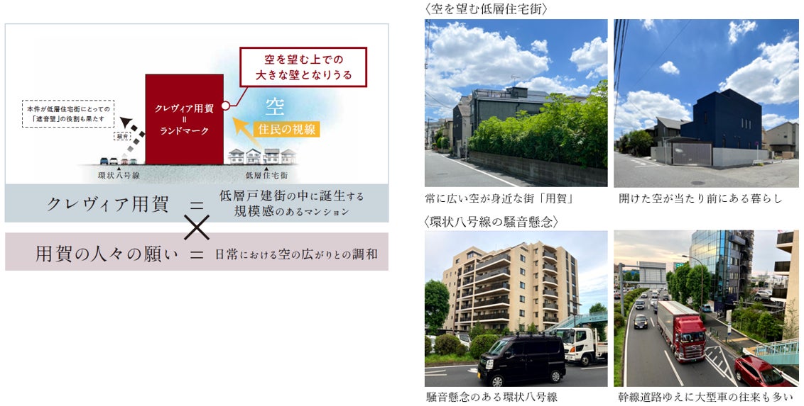 1.背景の空を広く見せるため、建物をあえて中低層化。