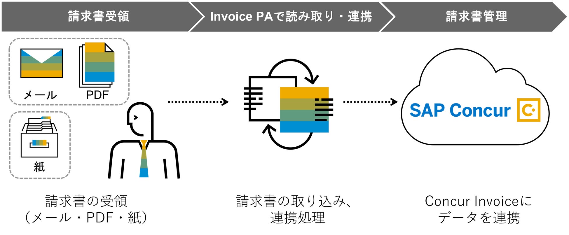 この度、SAP Concur App Centerのサービスとして、ニーズウェルの請求書自動登録サービス「Invoice Process Automation (Invoice PA)」を提供開始いたします。Invoice PAをご利用いただくことで、紙、PDF、メールなど様々な手段で届く請求書を読み取り、コンカーの請求書管理クラウド「Concur Invoice」に登録することが可能です。紙の請求書であれば複合機などでスキャン、メールやPDFであればInvoice PAに転送するだけで、経費タイプや支払先といったデータが自動で連携されるため、業務負荷を大幅に削減し、さらに担当者の出社抑制とペーパーレスを実現します。