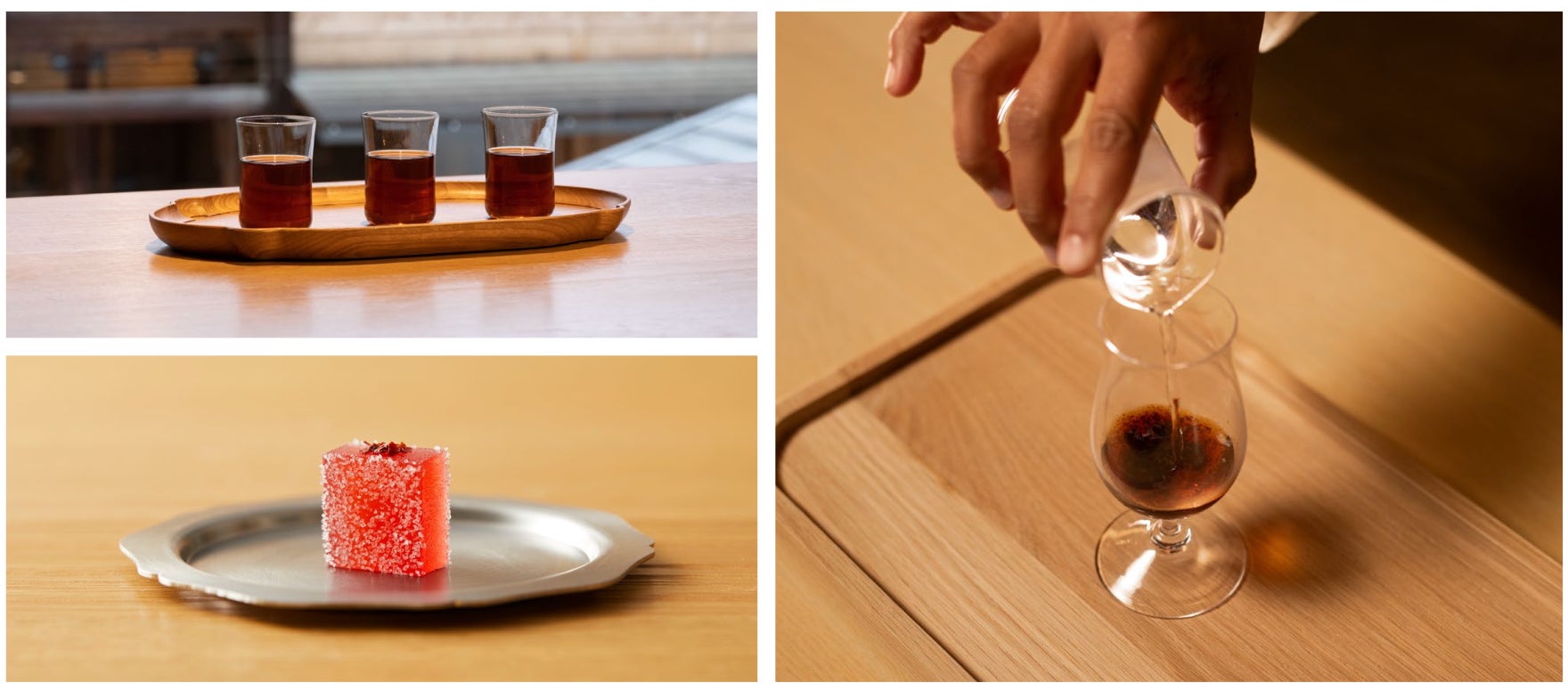 「Blue Bottle Studio - Kyoto -」では、各回5席限定で予約制のコーヒーコースをご提供いたします。コースはコーヒーの葉、花、果実を余すことなくお楽しみいただける「リーフ、フラワー、チェリー」の3種のオリジナルドリンクから始まります。葉、花、果実というコーヒーノキの普段味わうことのない、さわやかで多様な側面をお楽しみいただけます。続けてお楽しみいただくのは、今回新たにご用意したドリンク「Soluble」です。Solubleは、XR(Exceedingly Rare=極めて希少な)コーヒー豆を使用して誕生した特別なインスタントコーヒーです。コーヒー豆のロースト、抽出、結晶化の工程を全て行い、コーヒーが持つ本来の豊かなアロマと味わいを最大限に引き出しました。最高峰のコーヒー体験をお届けするため、日本のブルーボトルコーヒーとして初めてご提供いたします。世界中から厳選した非常に希少なシングルオリジンのコーヒー豆3種のフライトセットでは、ユニークで特別なコーヒーとの出会いがみなさまをお待ちしています。コーヒーの過去や歴史を再解釈しコーヒーの魅力を表現したメニューをぜひお楽しみください。コーヒーとご一緒にお召し上がりいただくのは、「Tangentes」の後藤裕一氏と仲村和浩氏監修によるスイーツ。この秋は、京都の美しい紅葉をイメージし、紅玉とレッドカラントでお作りしたパートドフリュイと、コースの終盤にあたたかい状態でお楽しみいただくフィナンシェをご用意しております。