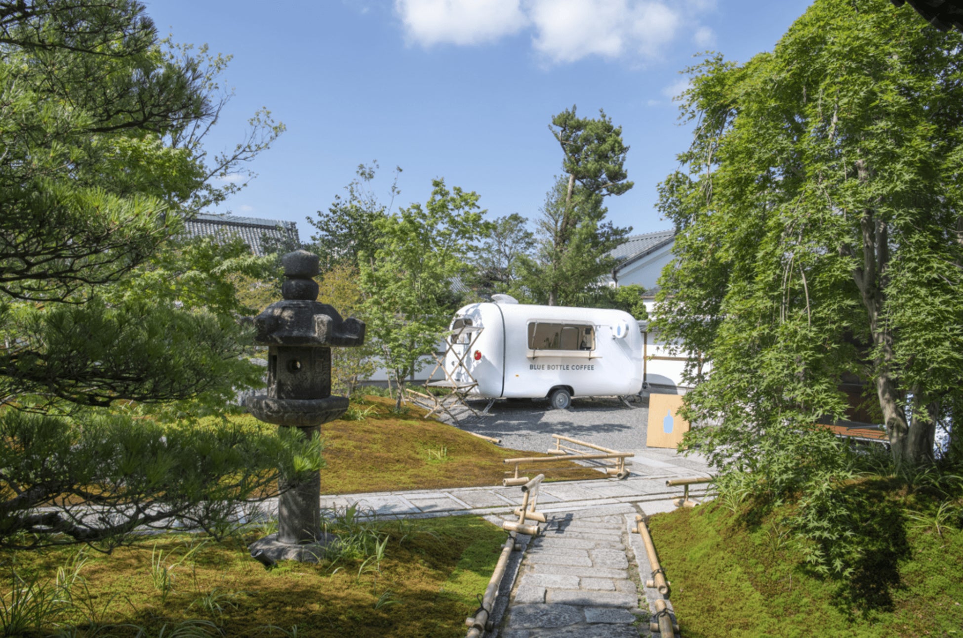 ブランドロゴを入れたクラシックなデザインの車体に、エスプレッソマシンを搭載した移動式カフェ「ブルーボトル コーヒートラック」。ブルーボトルコーヒーのカフェがない地域にも私たちのコーヒーをお届けしたいという想いから、さまざまな場所で多くのゲストのみなさまにおいしいコーヒーと忙しい日常の中でもほっと一息つけるお時間をご提供してまいりました。今年の春には、京都最古の禅寺・建仁寺の塔頭西来院内に出店いたしました。京都の宇治茶専門店「祇園辻利」とコラボレートし誕生した、ここでしか味わえない日本のブルーボトルコーヒー初となる「抹茶ラテ」や、アウトドアシーンに向けて開発した「アウトドア ブレンド」のエスプレッソを使用したドリンクをご提供し、塔頭西来院の美しい庭園を眺めながらお楽しみいただく、特別な体験を多くのゲストのみなさまにお楽しみいただきました。夏季休業を経てこの秋は、抹茶ラテでコラボレートした「祇園辻利」の抹茶を使用した限定フードメニュー「抹茶 テリーヌ ショコラ」を新たにメニューにラインナップし、みなさまのお越しをお待ちしております。