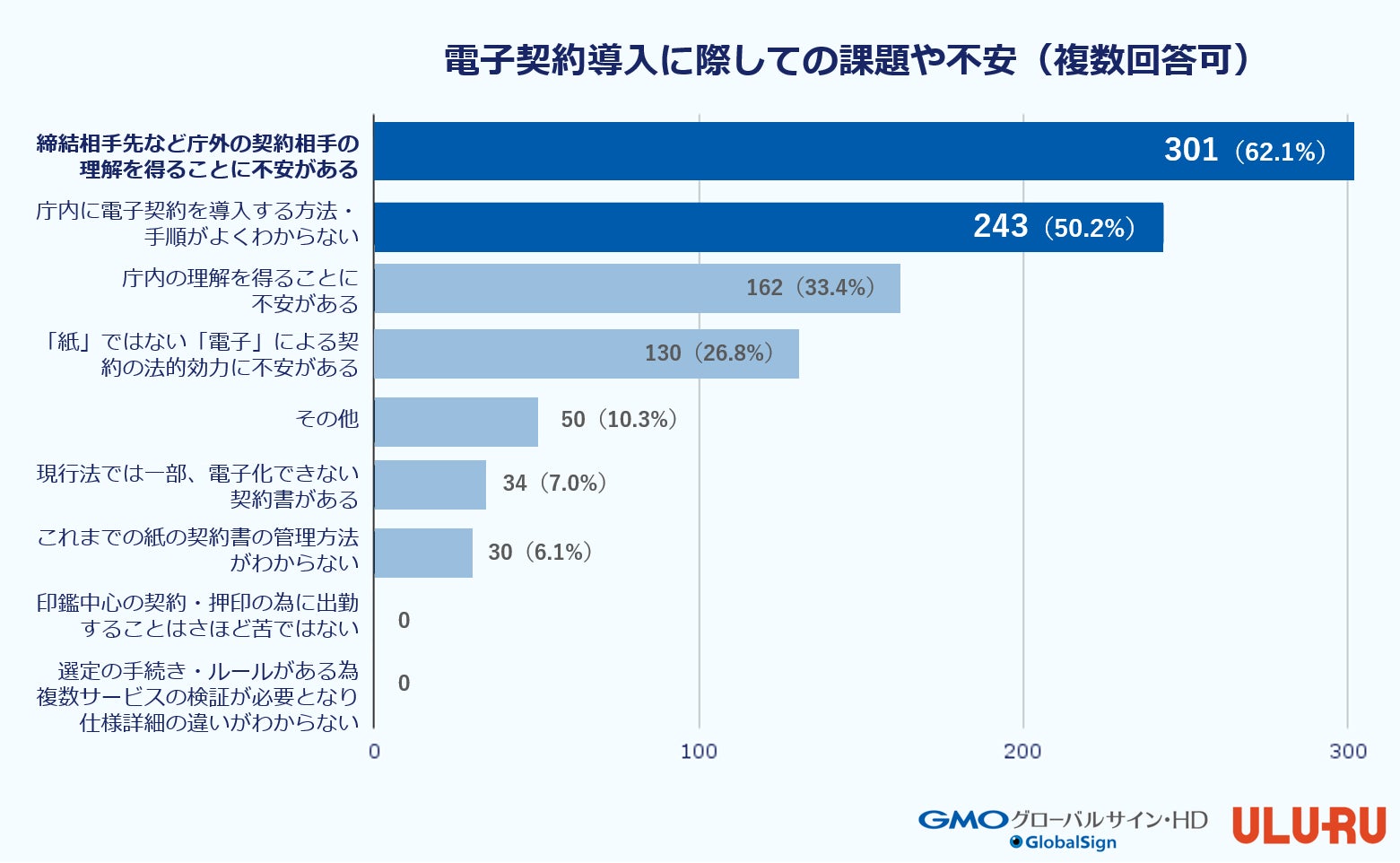 ・電子契約導入に際しての不安要素について最も多かったのは、「庁外の契約相手先とのやり取りや理解が不安」(62.1%)で、6割以上の自治体で同じ不安を抱えていることが判明