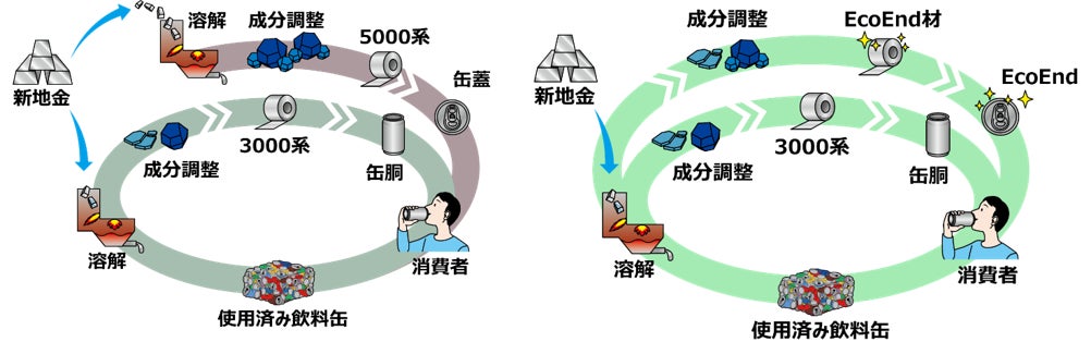 「EcoEnd」の開発により、従前は困難であった、多くのリサイクル原料を缶蓋にも循環させることが溶解後の成分調整と製造技術の工夫により実現可能となりました。今後は蓋にもより多くのリサイクル原料が循環使用されることとなり、新地金の使用量削減にともなうGHG排出量削減が期待されます。「EcoEnd」により実現される新しいアルミ材循環フローは、以下のとおりです。