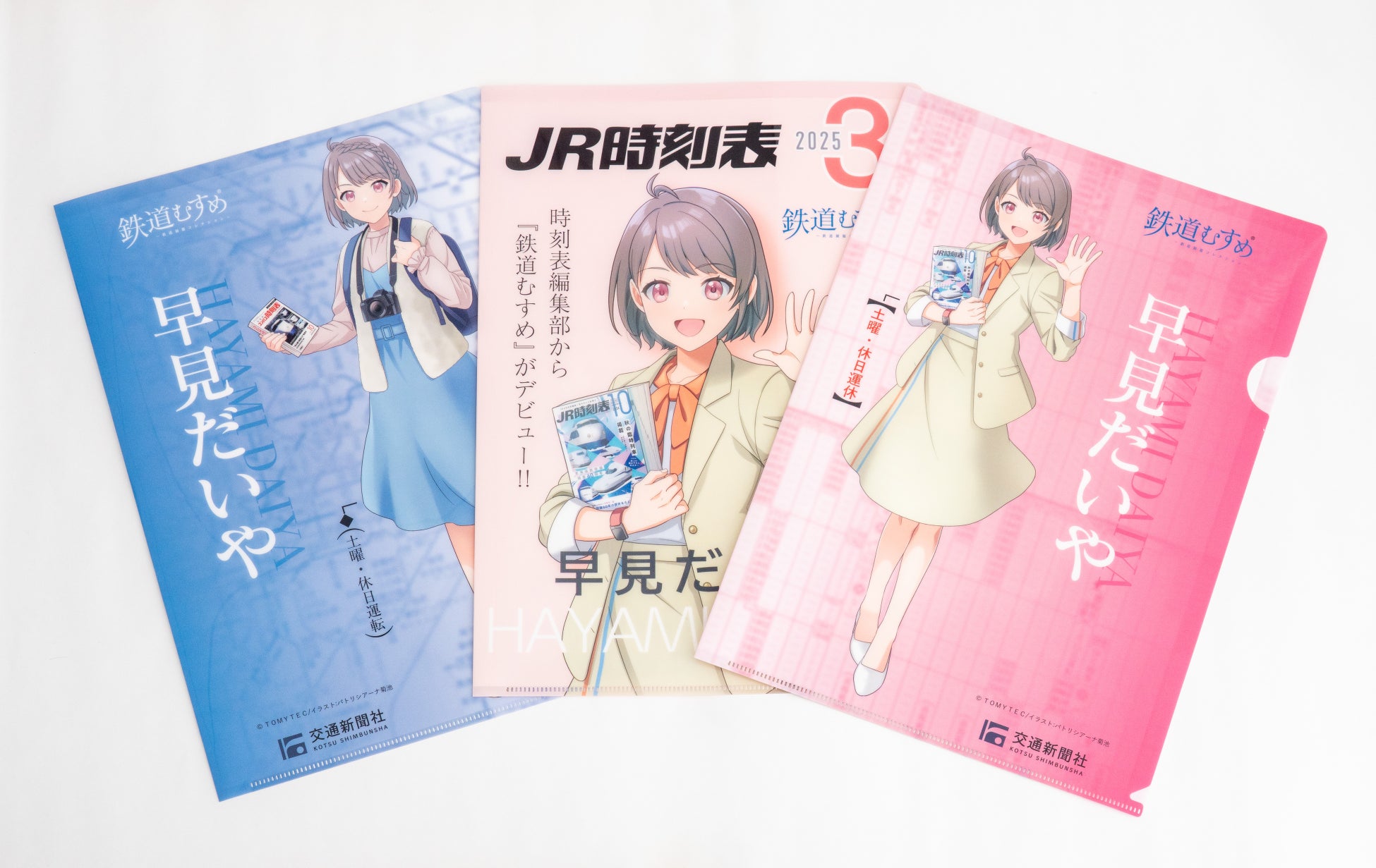 時刻表のデザインが散りばめられたクリアファイルです。 JR時刻表初登場時のビジュアル、平日の仕事服姿、休日の私服姿をそれぞれにあしらった3枚セットです。