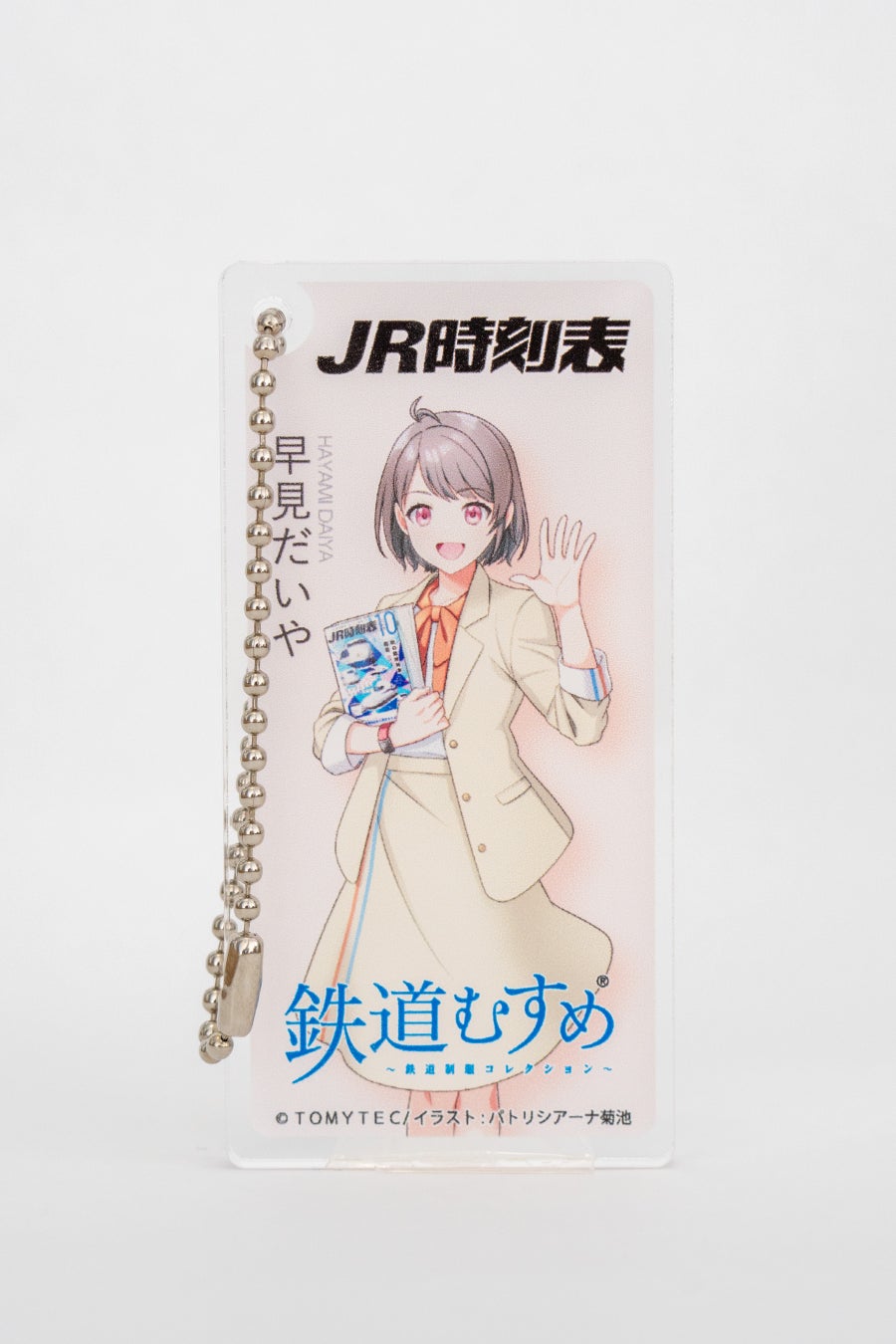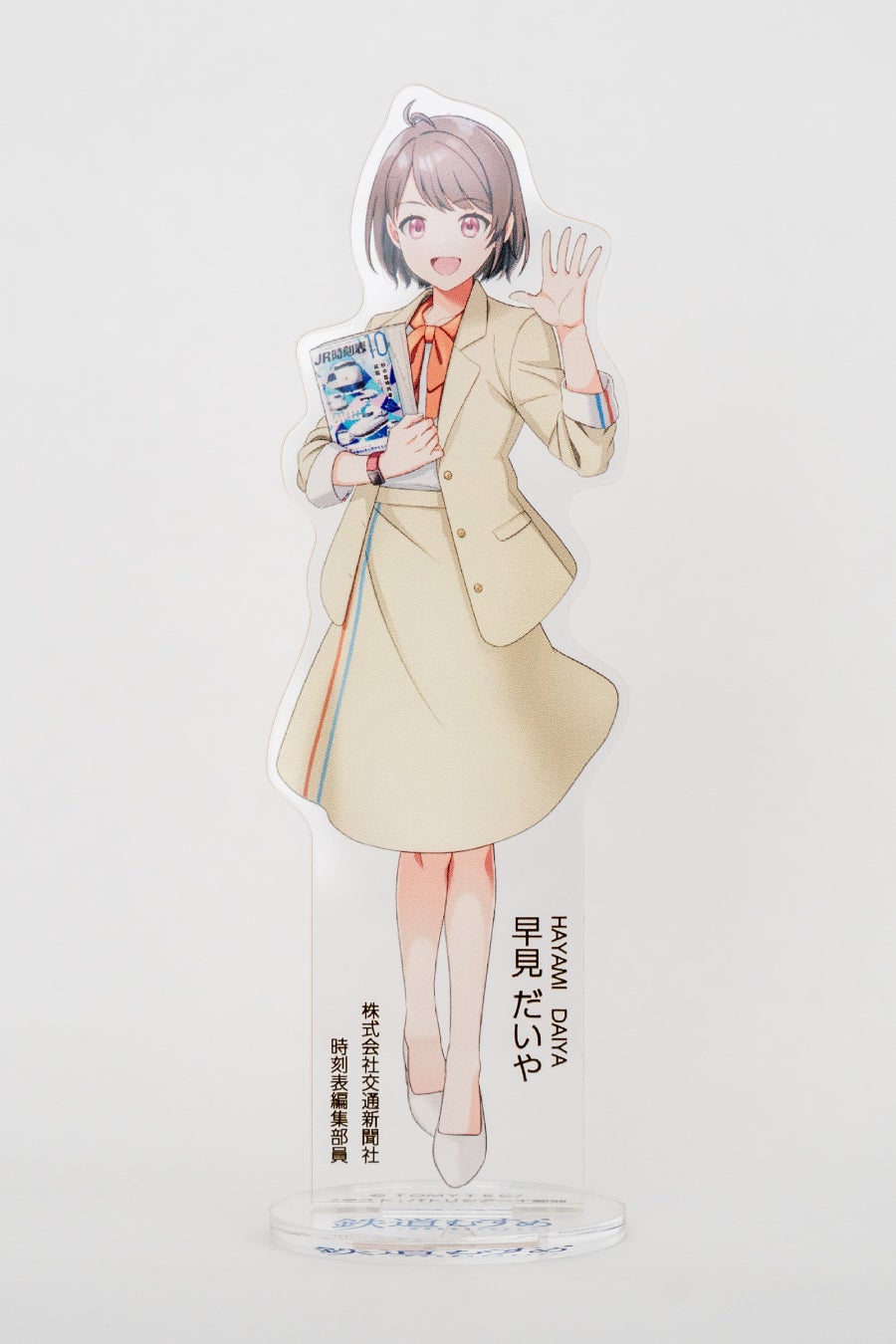 人気のアクリルスタンドをラインナップ。JR時刻表を抱えた仕事服姿を全高130mmのアクリルスタンドにしました。