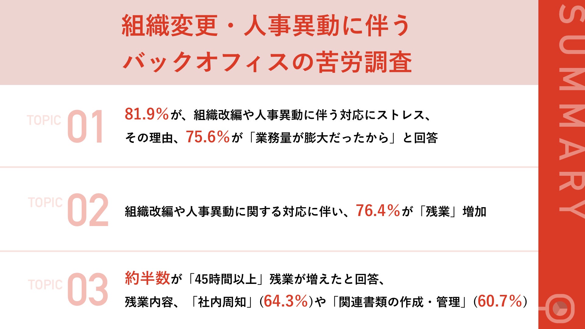 大企業のバックオフィス勤務者約8割が3月〜4月の組織改編・人事異動で「ストレス」を実感 業務量が膨大となり、76.4%が残業増加