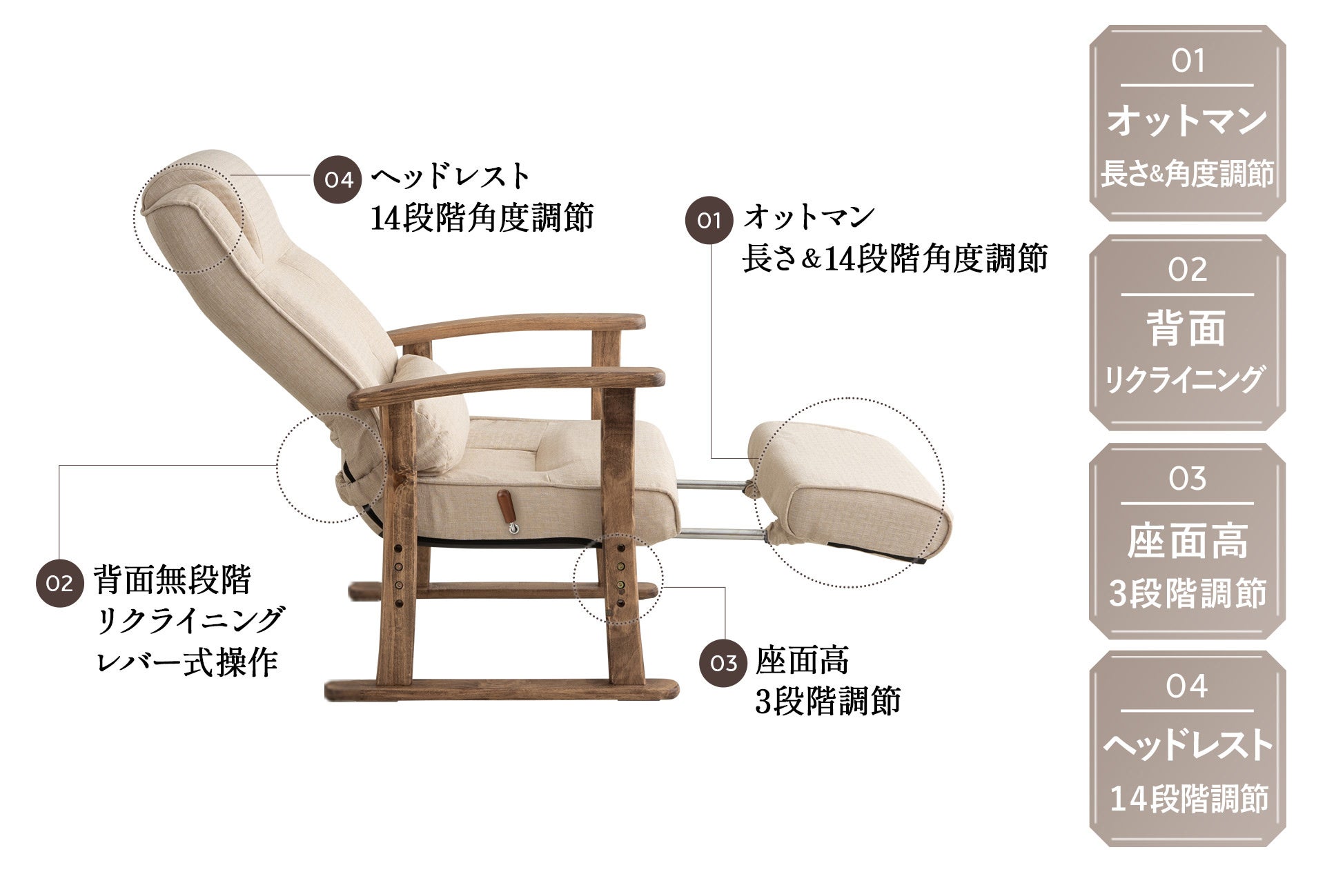 1:オットマン長さ&角度調節機能