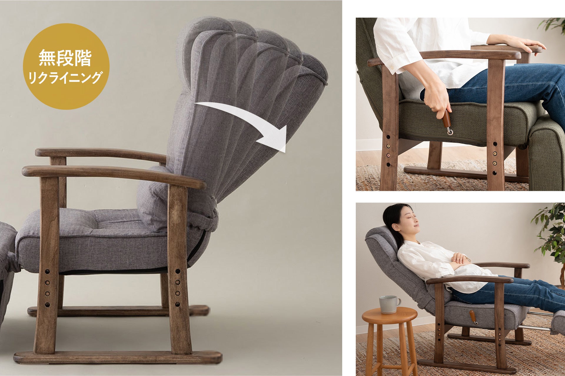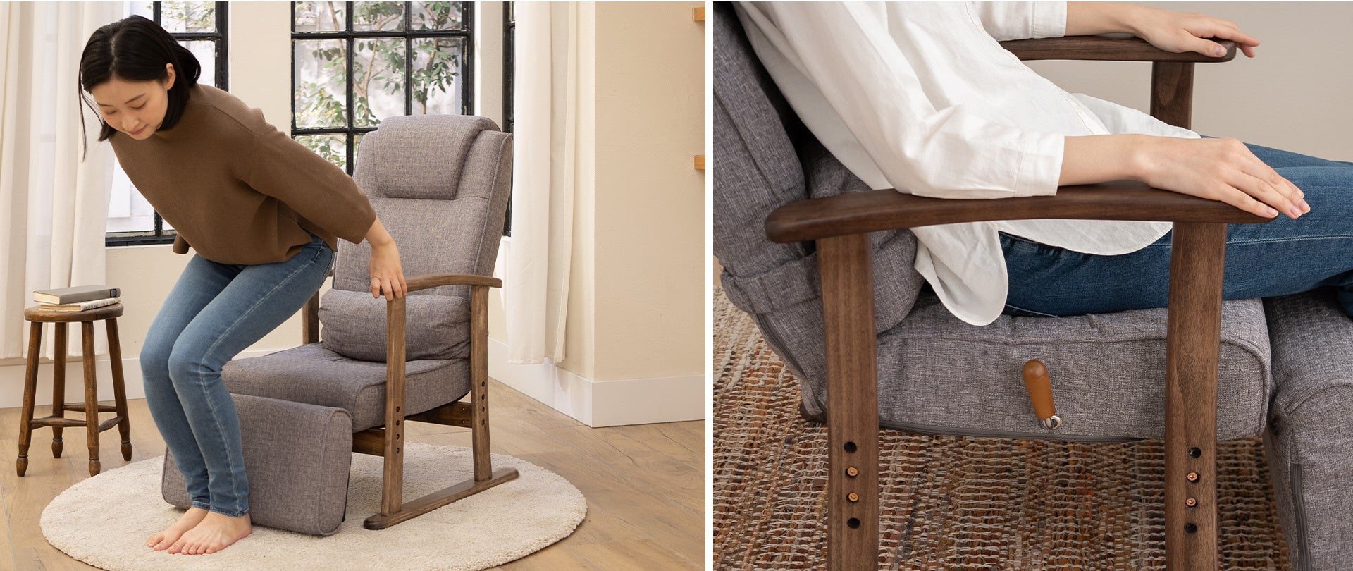 天然木でつくられたゆるやかなカーブの肘掛は、リクライニングの際も肘から腕にかけてフィットするようデザインされ、しっかりと掴みやすい設計。毎日の立ち座りをサポートします。