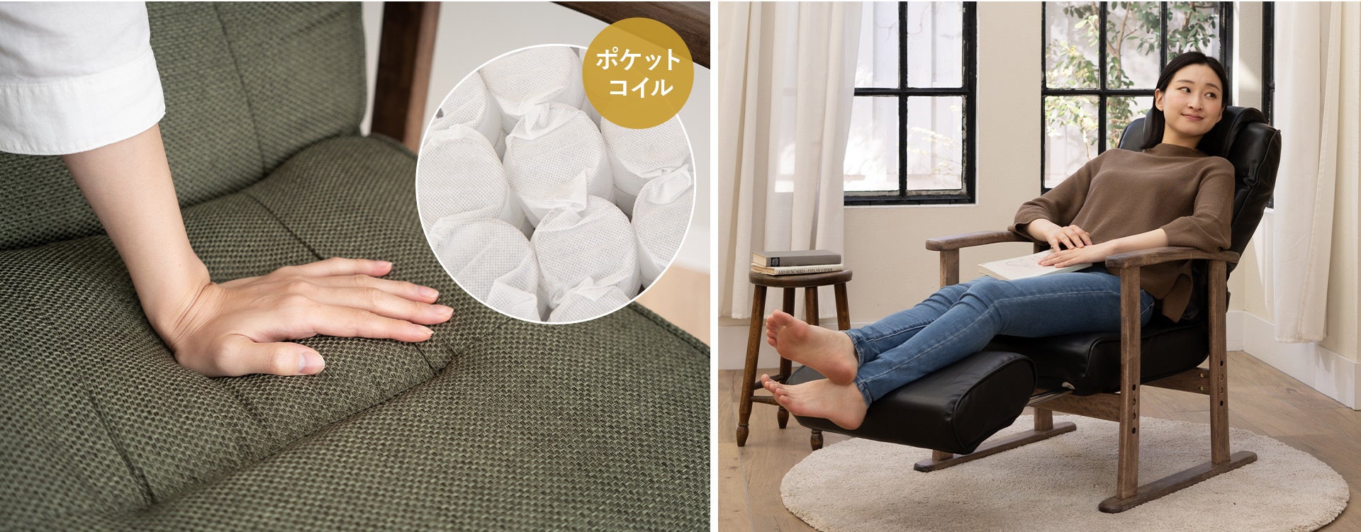 座面は高級ベッドにも使われるポケットコイルを採用。点で体を支える構造によりフィット感や弾力性が高く、抜群の座り心地を実現。耐久性にも優れ、へたりにくい素材です。