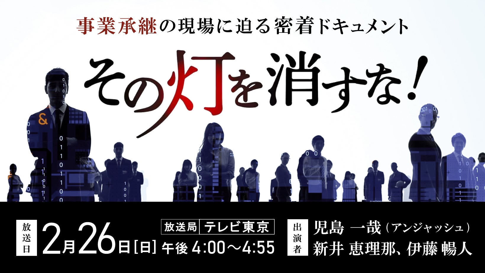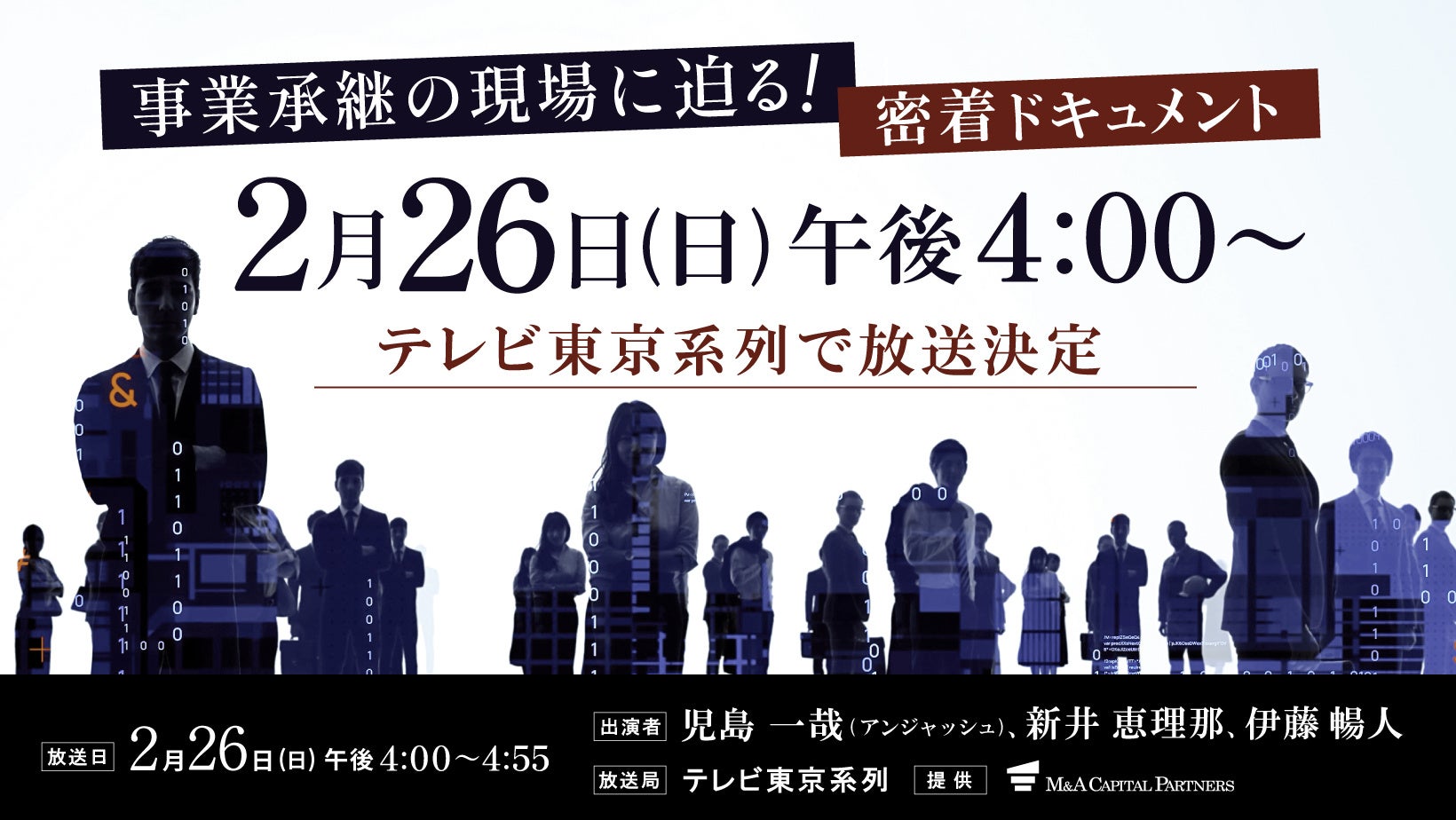 M&Aキャピタルパートナーズ株式会社(東京都中央区・代表取締役社長 中村悟)は、2023年2月26日(日)午後4時より、テレビ東京系列で放映される「THE 事業承継 その灯を消すな!」に番組提供いたします。