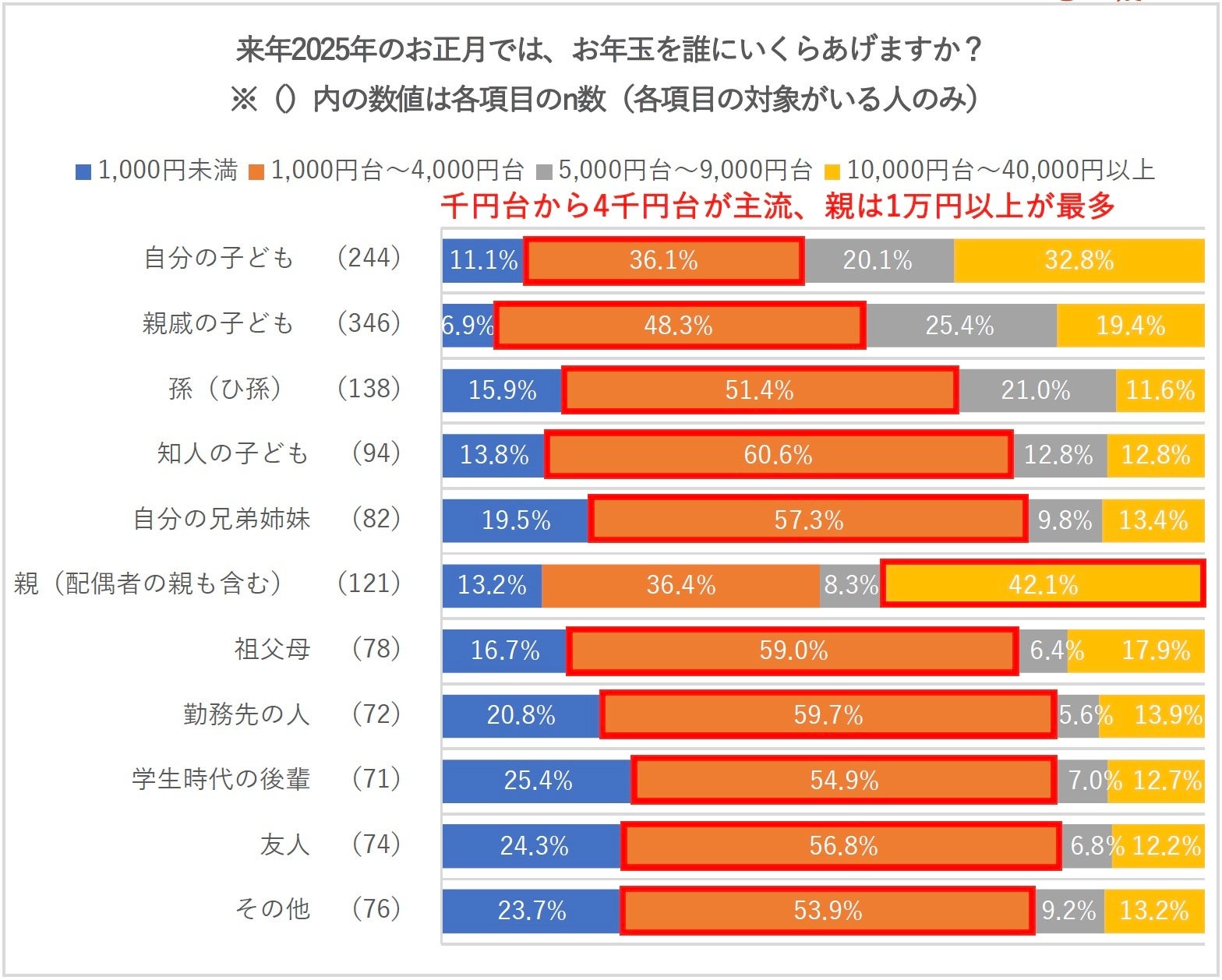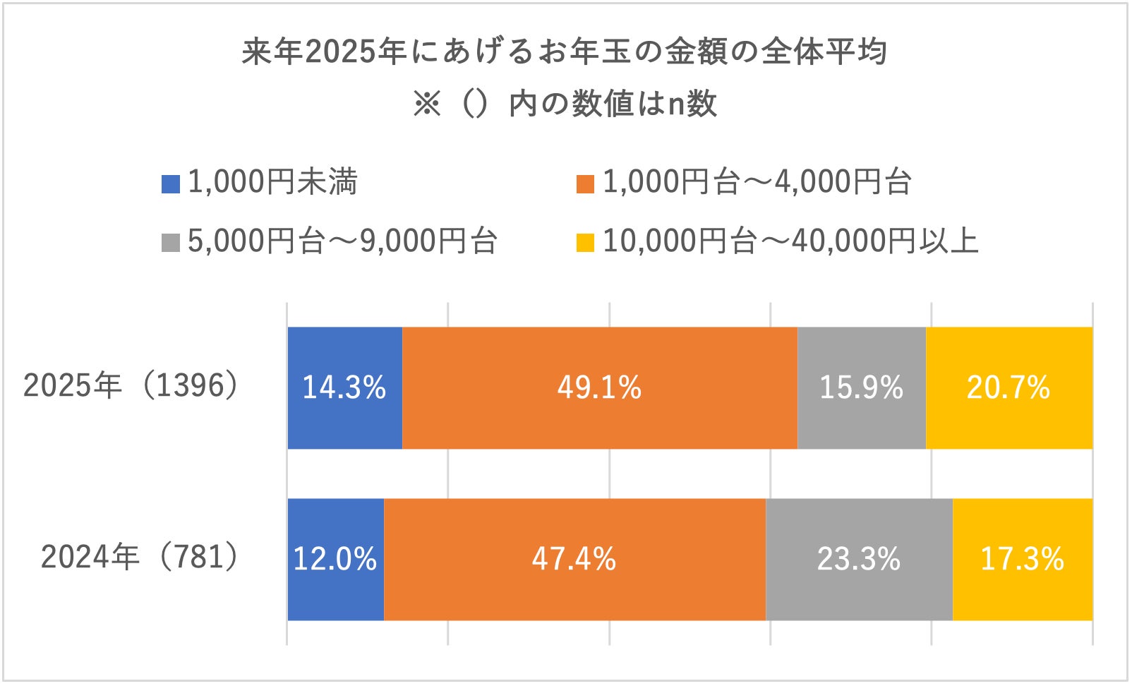 【2025年お年玉に関する実態調査】お年玉をあげる人4割強、あげる予定の人数は平均2.5人 金額は1,000円から4,000円台が主流も、10,000円以上あげる人が増加傾向