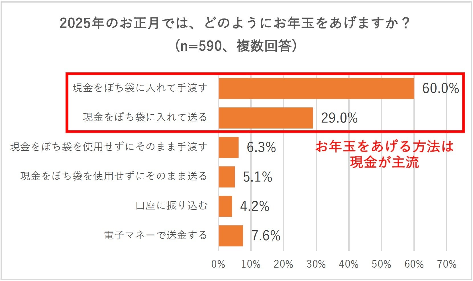 さらに「来年2025年のお正月では、どのようにお年玉をあげる予定か」と質問すると、「現金をぽち袋に入れて手渡す」が60.0%と最多だった。また「現金をぽち袋に入れて送る」は、昨年の調査結果(※1)12.8%から16.2%増の29.0%と増加傾向にあった。それ以外は「電子マネーで送金する」7.6%、「口座に振り込む」4.2%と1割以下にとどまり、お年玉のやりとりにおいては現金が主流であることがわかった。
