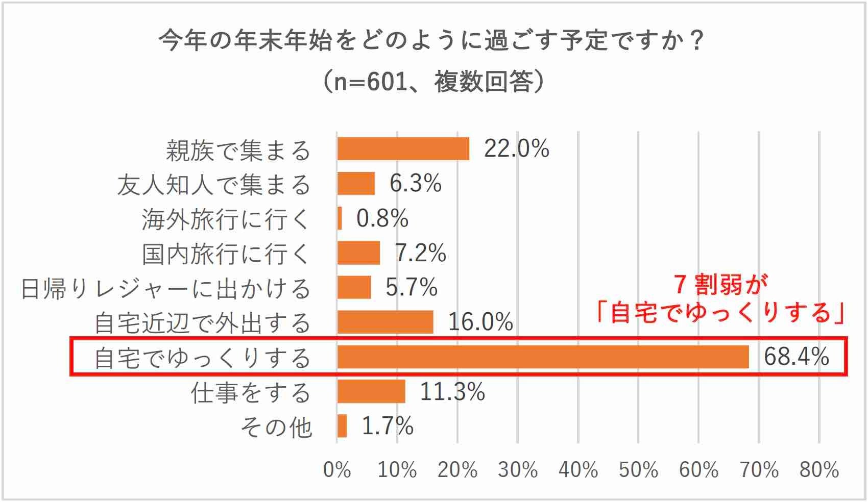 今年の年末年始は7割弱の人が自宅でゆっくりする予定であることがわかりました。また、「自宅でゆっくりする」に次いで2割強の人が親族で集まる予定でした。