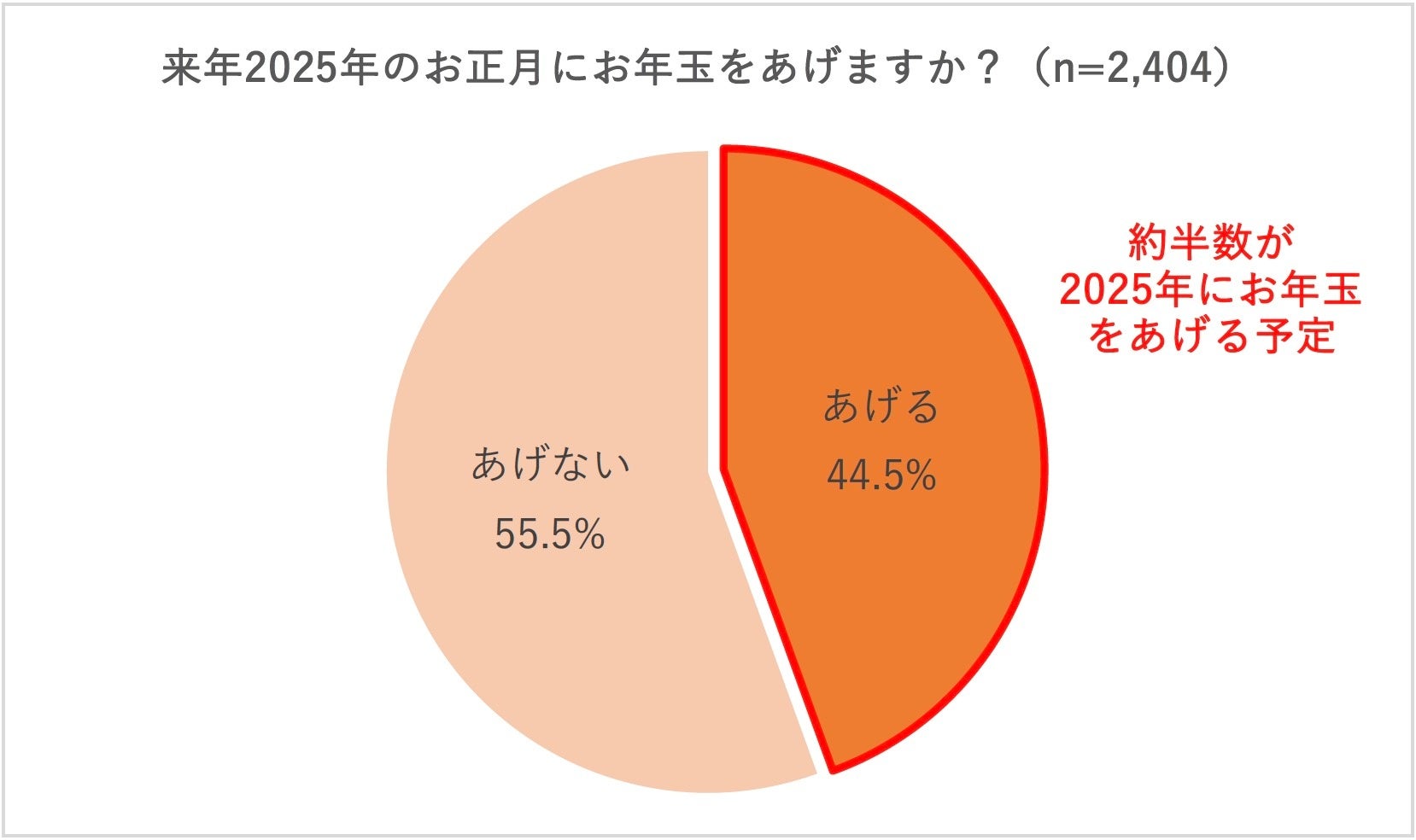 20代以上の男女2,404名を対象にした調査で「来年2025年のお正月にお年玉をあげるか」の質問に対し回答は「あげる」が44.5%と、2025年は約半数の人がお年玉をあげる予定であることがわかった。