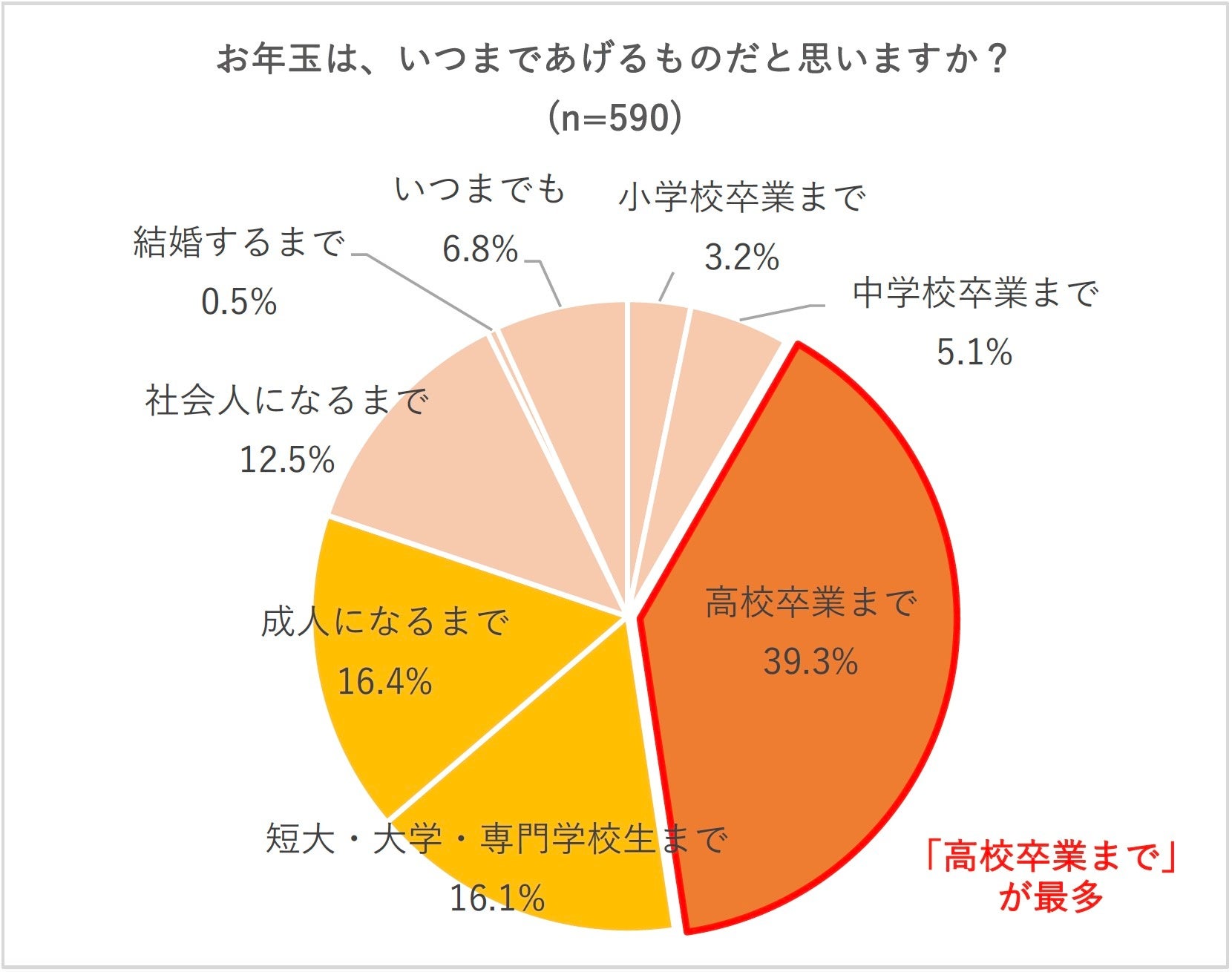 「お年玉は、いつまであげるものだと思うか」の質問に対し回答は、最多が「高校卒業まで」39.3%、次いで「成人になるまで」16.4%、「短大・大学・専門学校生まで」16.1%だった。