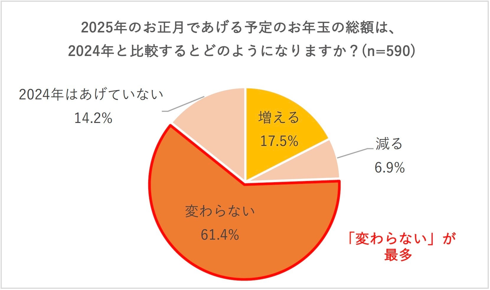 「来年2025年にあげる予定のお年玉の総額は、今年2024年と比較するとどのようになるか」の質問に対し回答は、「変わらない」61.4%と最多で、次いで「増える」17.5%だった。
