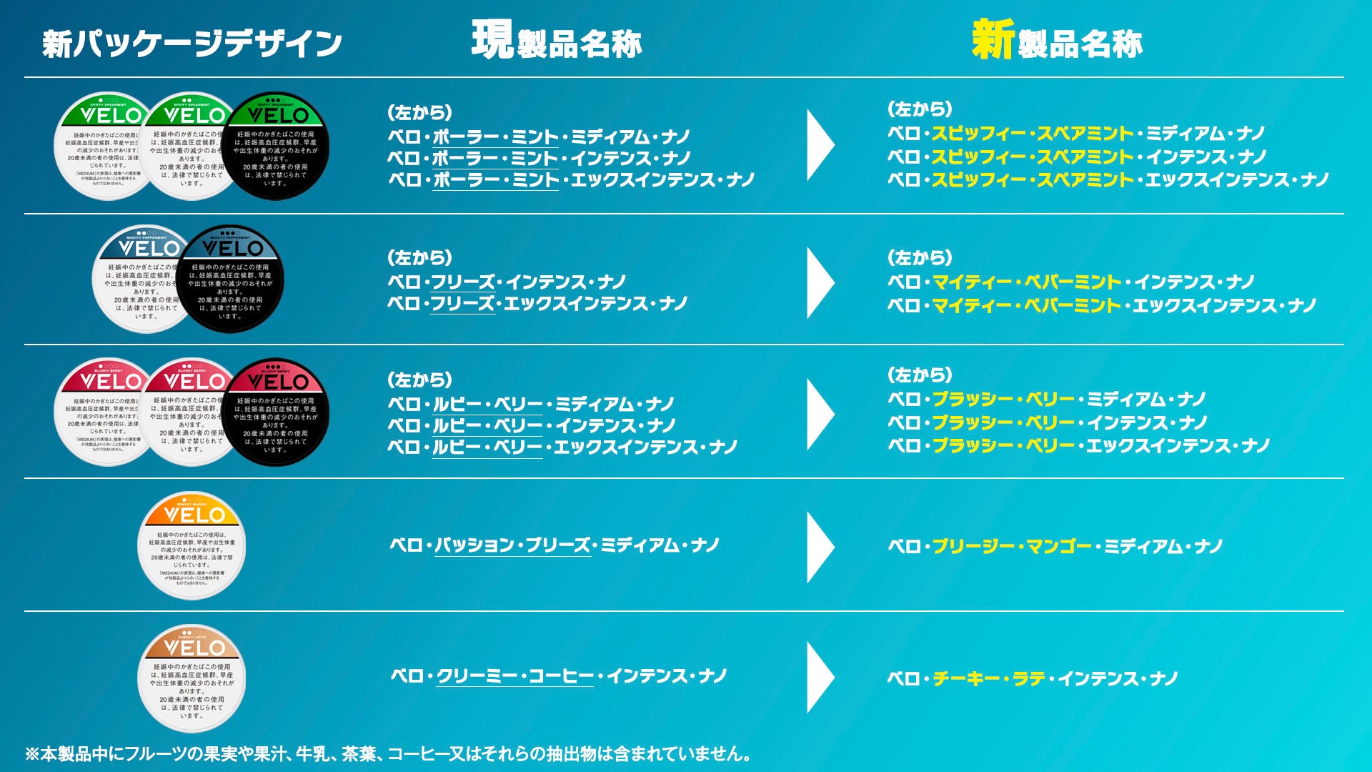パッケージデザインのリニューアルと併せて、現在販売中の10銘柄の製品名称もリニューアルします。新しい製品名称は、味わいを表現する既存の名称に加え、「予想外ってワクワクする(WEIRDLY WONDERFUL)」なVELOのブランドキャラクターを体現する「spiffy(おしゃれ)」や「cheeky(やんちゃ)」などの表現を追加したネーミングとなっています。