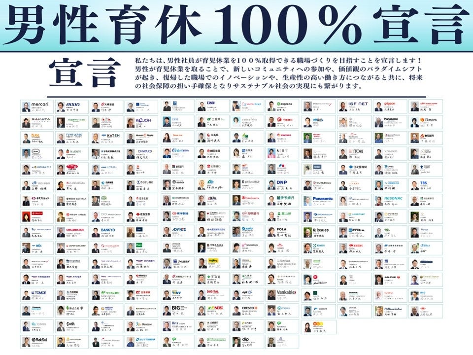 当社が2019年3月より募集を開始した企業・組織の代表者による宣言で、「現在、自社内で男性の育児休業取得率100%の実現を目指して取り組んでいる」組織および「今後、取得率をあげて、いずれは100%を目指したい」組織により構成されるものです。企業規模や現在の取得状況などは問わず、将来的に男性であっても育児休業が取得しやすい環境の実現に経営者としてコミットすることを明示するためのもので、2024年8月22日の時点で185社の宣言が集まっています。