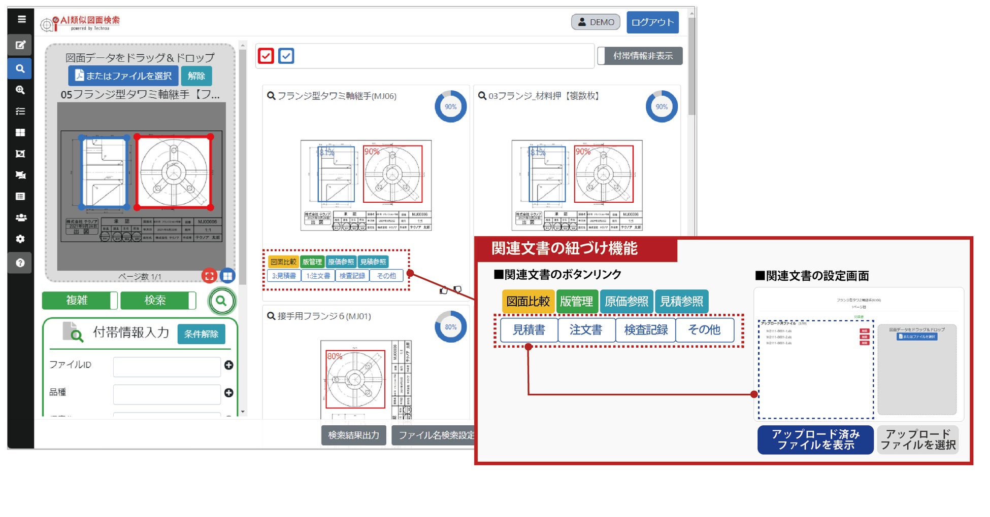 類似図面をAIが類似度順にサムネイル表示する検索結果画面に、関連文書の参照ボタンを追加しました。見積書や検査記録、過去の原価帳票など、図面以外の関連文書を図面に紐づけて登録でき、『AI類似図面検索』から直接閲覧できます。モノづくりに必要となる様々な情報を確認できるため、検索後の見積や設計業務の効率化を図ります。