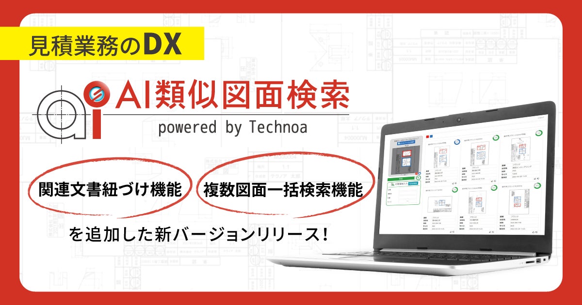 株式会社テクノア(本社:岐阜県岐阜市、代表取締役:山﨑 耕治)は、2024年6月1日(土)に『AI類似図面検索』の新バージョン(Ver.2.6)をリリースします。今回のリリースで、図面に対して見積書や検査記録などの関連文書が紐づけ可能となりました。見積や製造プロセスにおける文書確認に要する時間を削減し、業務の効率化を図ります。また、ユーザビリティの向上を目指し、操作の省力化を図るために、複数図面の一括検索機能も追加しております。