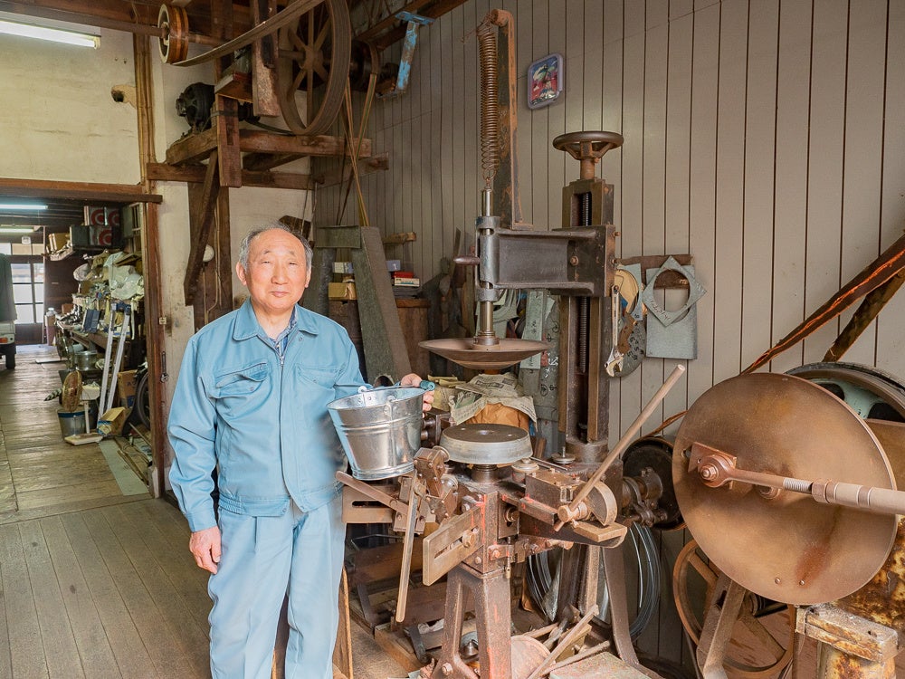 内海さん「内海製作所ではトタン(亜鉛メッキ)をはじめ、ステンレスや銅、真鍮(しんちゅう)などの金属を加工して、製品を製造しています。つくっているのは、おもに生活道具です。バケツをメインに、ジョウロ、墓石用の花立てなどが代表製品ですね。今は製造が減りましたが、米を保管する貯米缶や座布団を保管する座布団缶、衣装を入れる衣装缶なども製造していました」100年以上の歴史をもつ内海製作所ですが、後継者不在のため、内海さんは廃業する決意をしました。そのときにのが、頭をよぎったのは、長年にわたり内海製作所で活躍してきた機械たちのことです。
