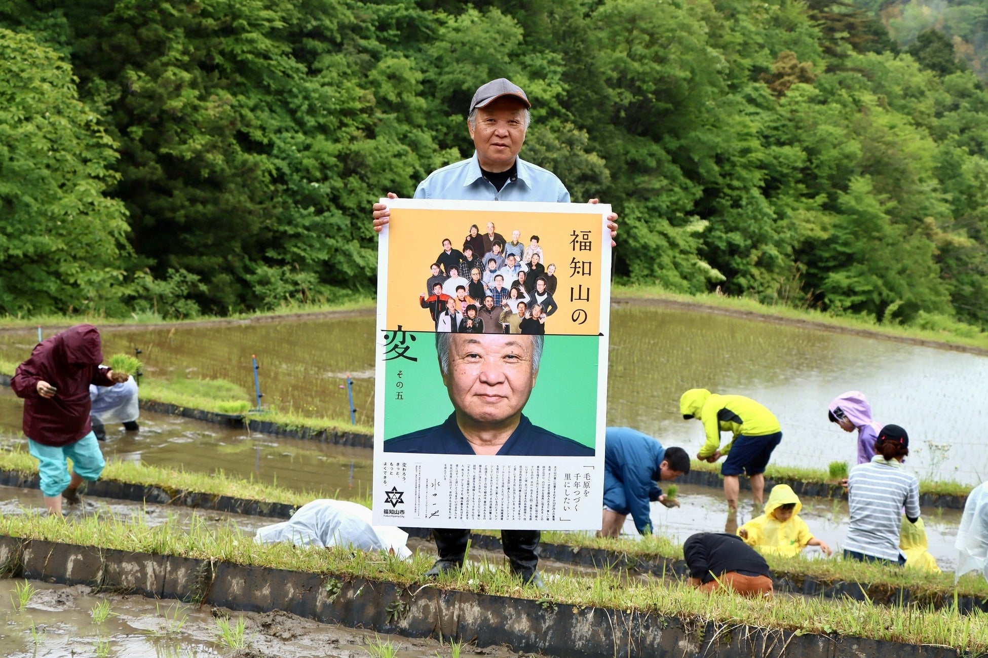 「福知山の変」のビジュアルは、“変化人”の頭の中を表しています。水口さんの「新しいチャレンジをするときは、住民みんなで話して納得したうえで行う」という信念を表現すべく、毛原の全住民26名の撮影を行い、ひとりずつアクリルスタンドに加工、組み合わせて撮影しました。そして「毛原を千年つづく里にしたい」と題し、ふるさとにUターンした水口さんが住民とともに、千年先の毛原に向けて一歩一歩進んでいくストーリーを掲載しています。水口さんは、完成したポスターを見て「まるで大家族のような全住民参加の作品になり喜んでいます」とコメントを寄せています。