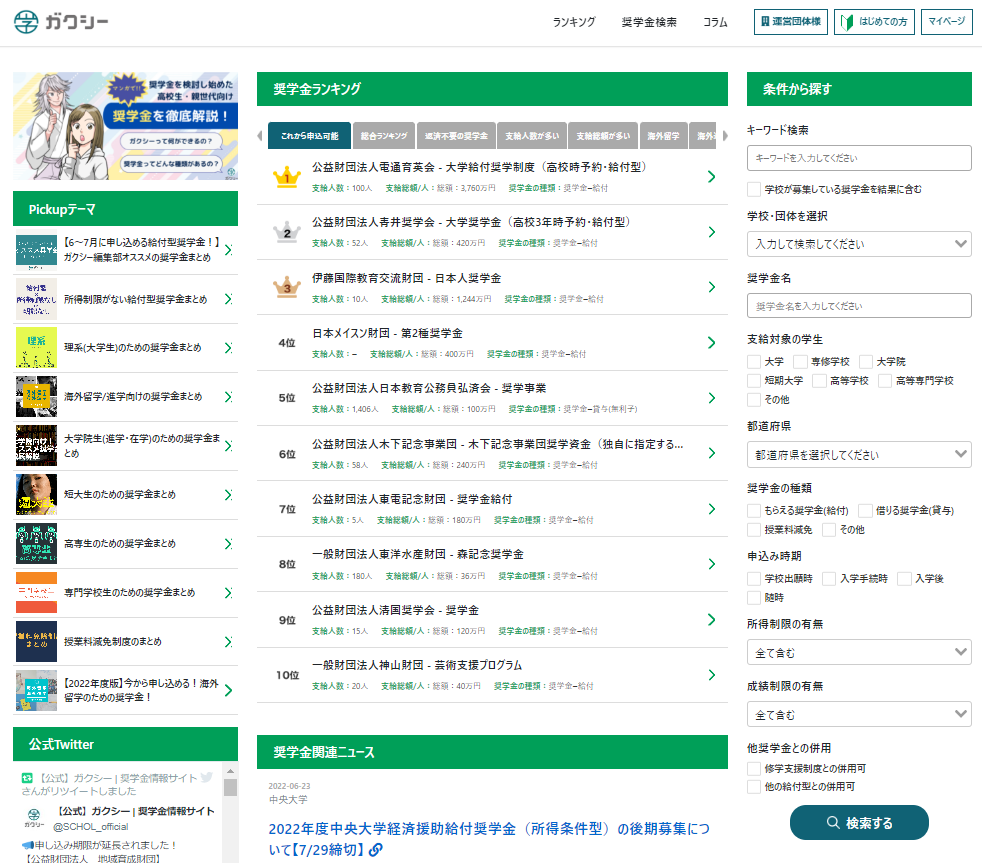 日本全国約15,000件以上の奨学金情報(支給対象・種類・支給額・人数・申込時期)が検索でき、2022年6月末時点で約10万人を超える学生・保護者が登録しています。