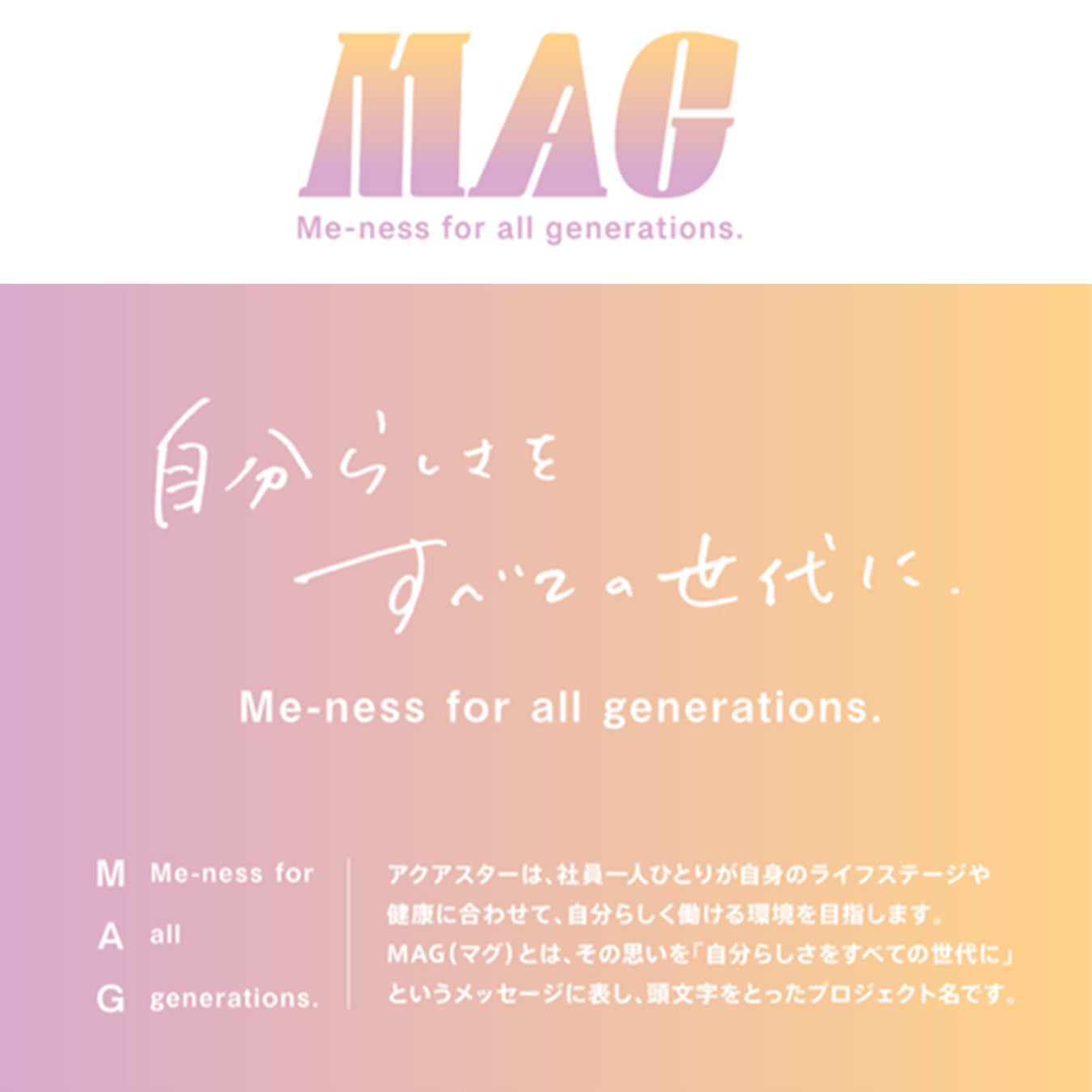 当社では、「すべての社員が安心して働き続けられる職場」を目指し、独自の福利厚生プロジェクト「MAG(Me-ness for all generations)」を2023年12月より推進しています。