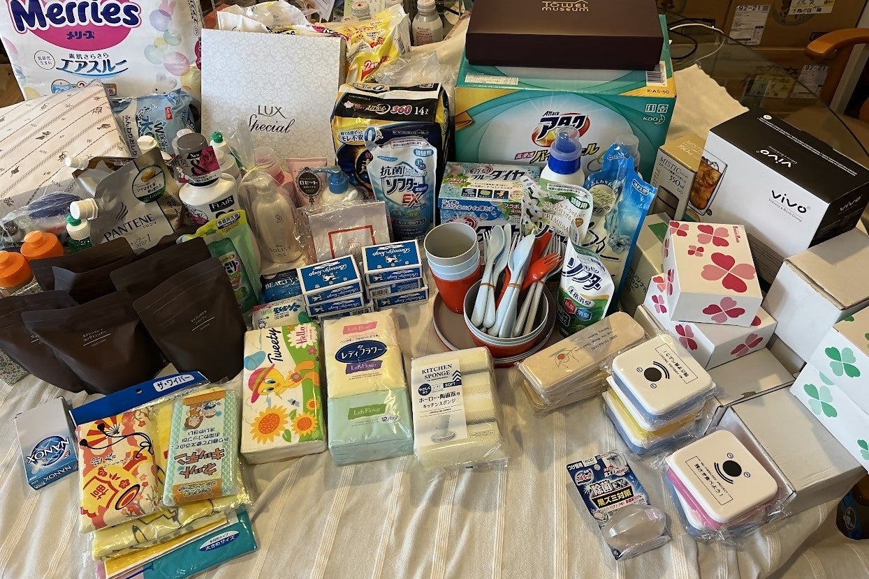 ・米 ・パスタ、そうめん等の乾麺 ・調味料(醤油、食用油等) ・飲料(アルコール飲料を除く) ・お菓子 ・缶詰 ・海苔、ふりかけ等の乾物 ・レトルト、インスタント食品 ・ペン、鉛筆、ノート等の筆記用具 ・はさみ、のり、ファイル等の文房具 |