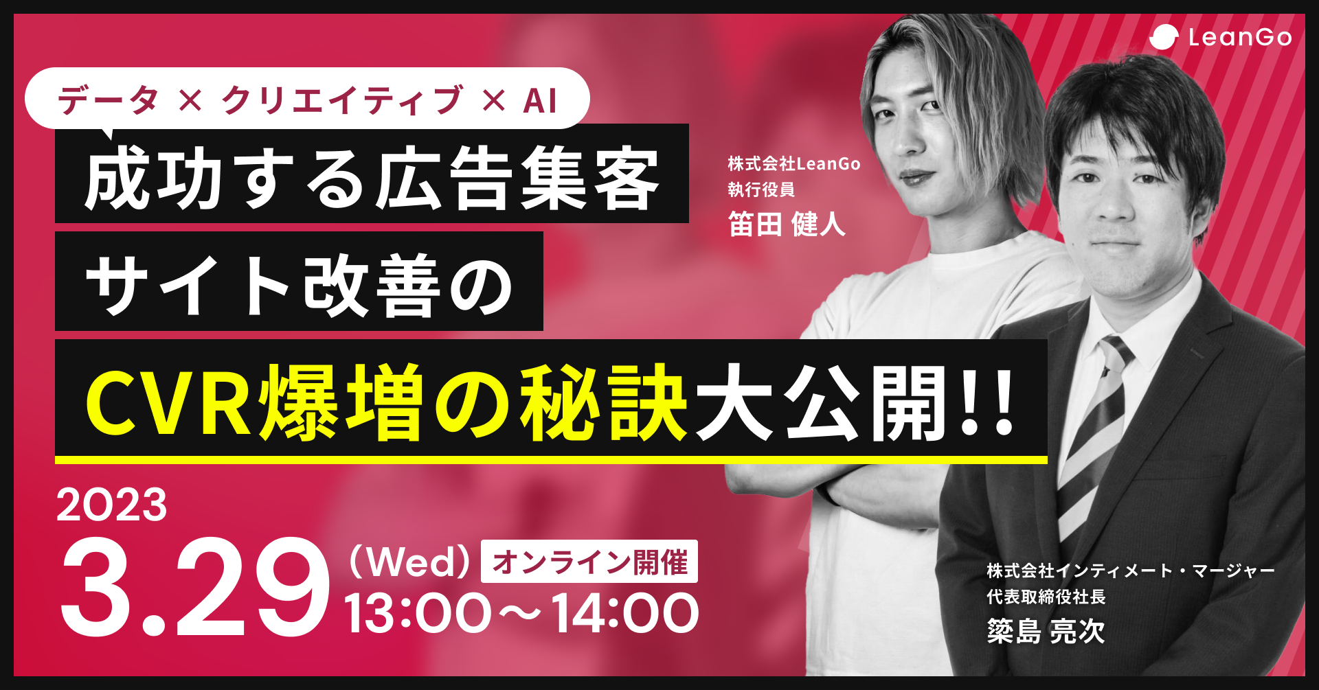 本セミナーでは、LeanGoの執行役員兼取締役・笛田健人とインティメート・マージャーの代表取締役社長・簗島亮次氏が「データ×クリエイティブ×AIで攻める!成功する広告集客とサイト改善のCVR爆増の秘訣を大公開!」をテーマにディスカッションしていきます。また、本セミナーに参加後、アンケート回答した方全員に、LeanGoからは『Webサイト・LPの無料診断会のご招待』を、インティメート・マージャーからは『広告最適化クッキー取得率無料診断』をプレゼントいたします。
