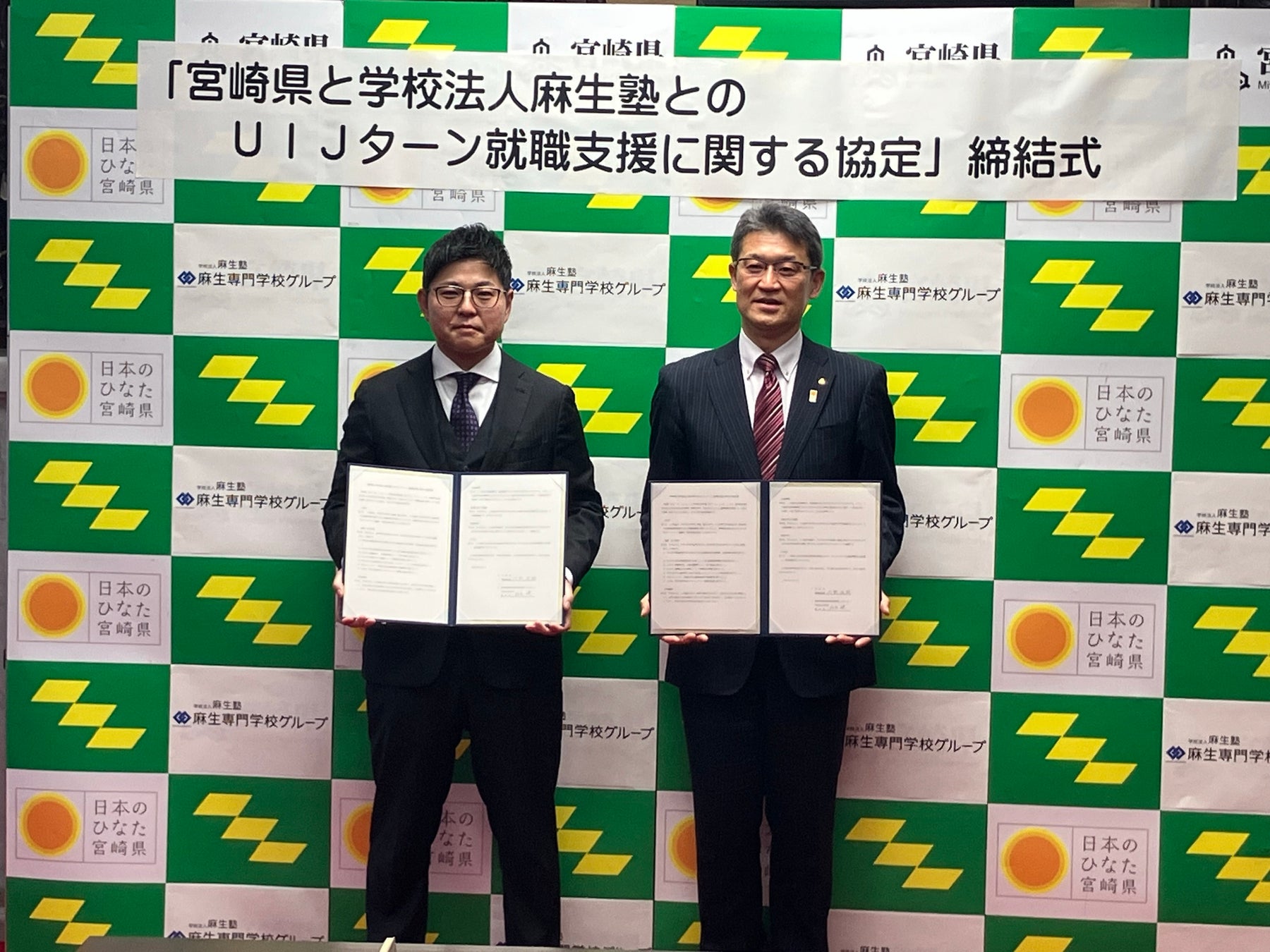 本協定は、宮崎県と麻生専門学校グループが相互に連携・協力し、宮崎県出身の学生を中心に、UIJターン就職の促進を図ることを目的としています。
