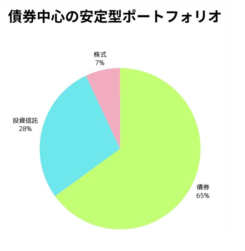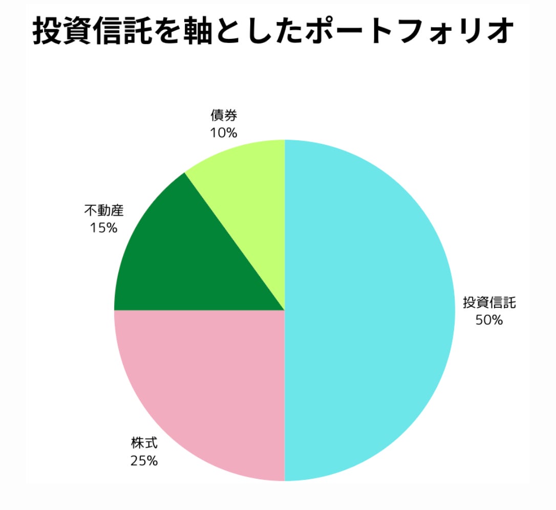 50代のポートフォリオの中心となっているのは「投資信託」と「株式」で、それぞれ63.7%と60.2%の回答者が何らかの形で組み込んでいる。例えば、ある回答者は、以下のように投資信託をベースにバランスの良いポートフォリオを構成している。