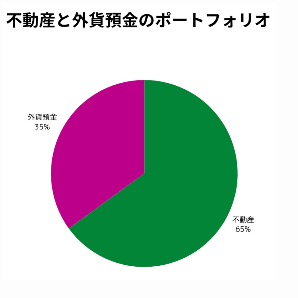 ただ、これら2種類の資産クラス以外で運用している50代も当然ながら存在する。以下のように、固定収入が得られる不動産と必要な時に現金を引き出しやすい外貨預金を活用し、高いリターンとリスクヘッジを両立させるポートフォリオがその一例だ。