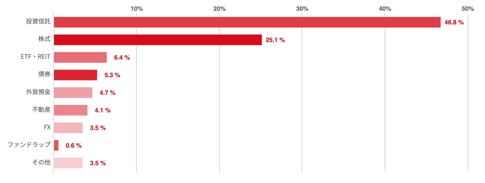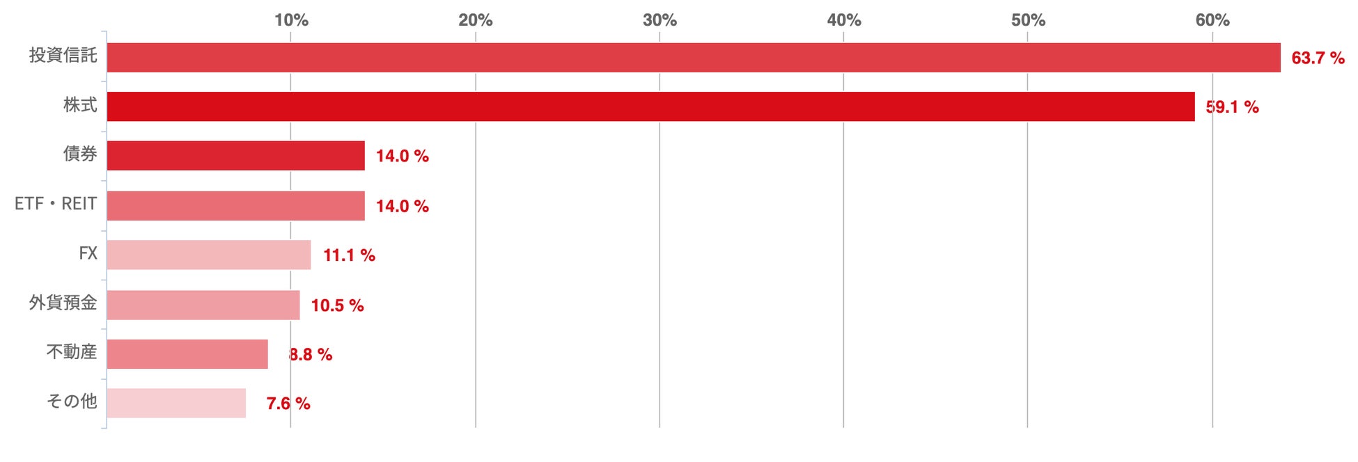 50代が主な運用先として選んでいるのは、「投資信託(63.7%)」と「株式(59.1%)」であった。他の年代と比べて、「債券(14.0%)」をポートフォリオに組み込んでいる投資家が多く、リスク回避の傾向が強いことが読み取れる。