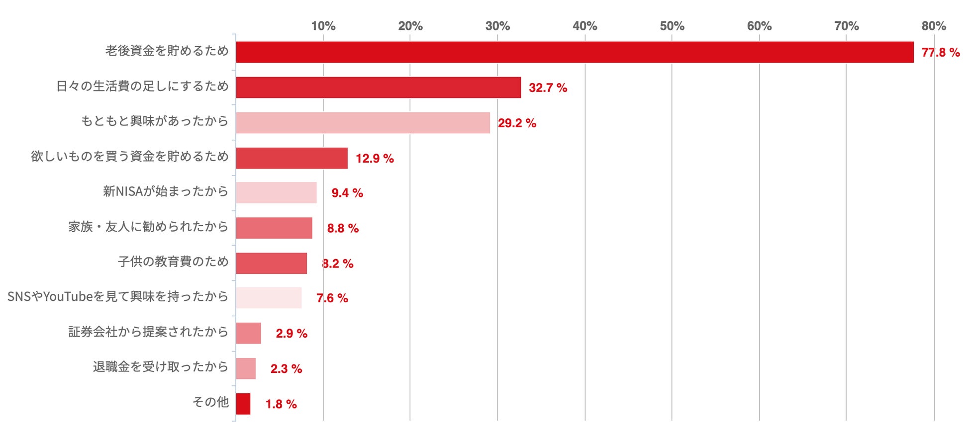 アンケートによれば、50代が資産運用を始めた理由として最も多かったのは「老後資金を貯めるため(77.8%)」であり、次点で「日々の生活費の足しにするため(32.7%)」が挙げられた。