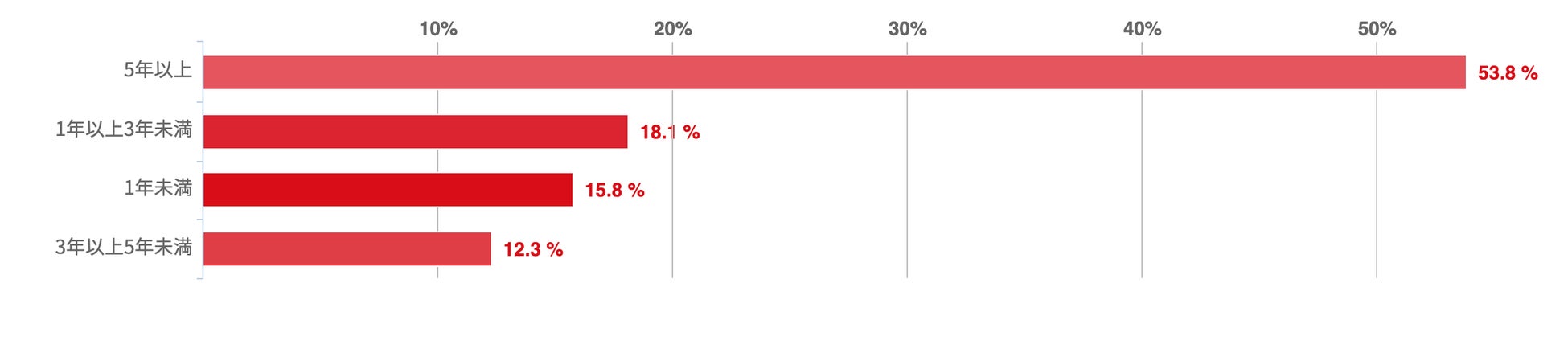 アンケートによれば、最も多い回答は「5年以上(53.8%)」であり、「1年以上3年未満(18.1%)」「1年未満(15.8%)」が続く形となった。