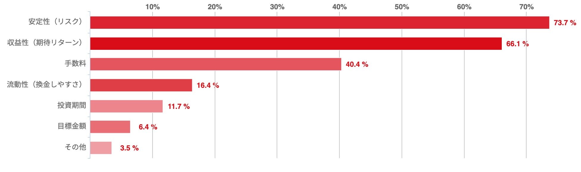 アンケートによれば、50代が運用先を選ぶ際に最も重視する要素は「安定性(リスク)」であり、73.7%の回答者が選択している。