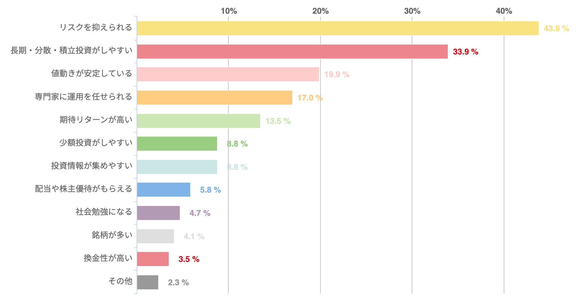 アンケートによれば、50代が投資信託や債券を推奨する理由としては、「リスクが抑えられる(43.9%)」が多く寄せられた。